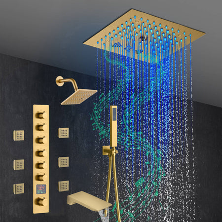 Brushed Gold 6-Way Thermostatic Shower Faucet: Flush Mount 12-Inch LED Light Shower Head with 64 Colors and Bluetooth Music,Tub Spout, 6 Jets