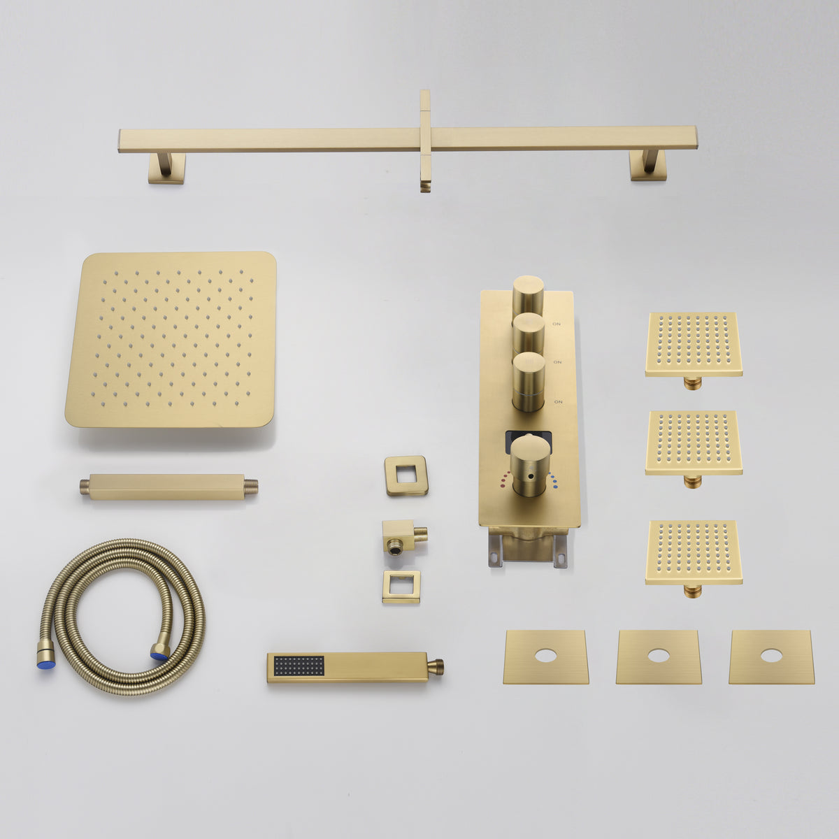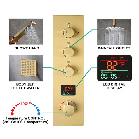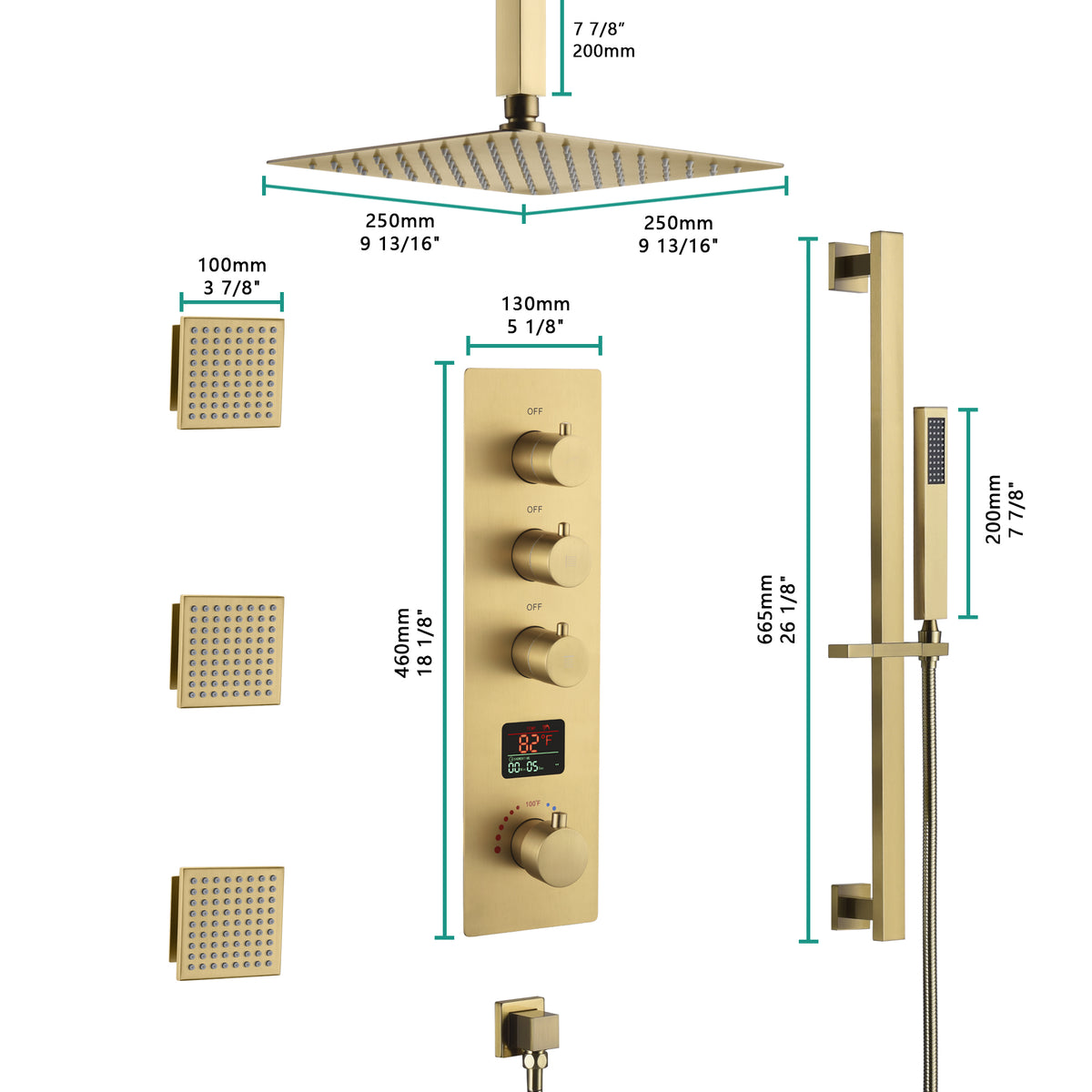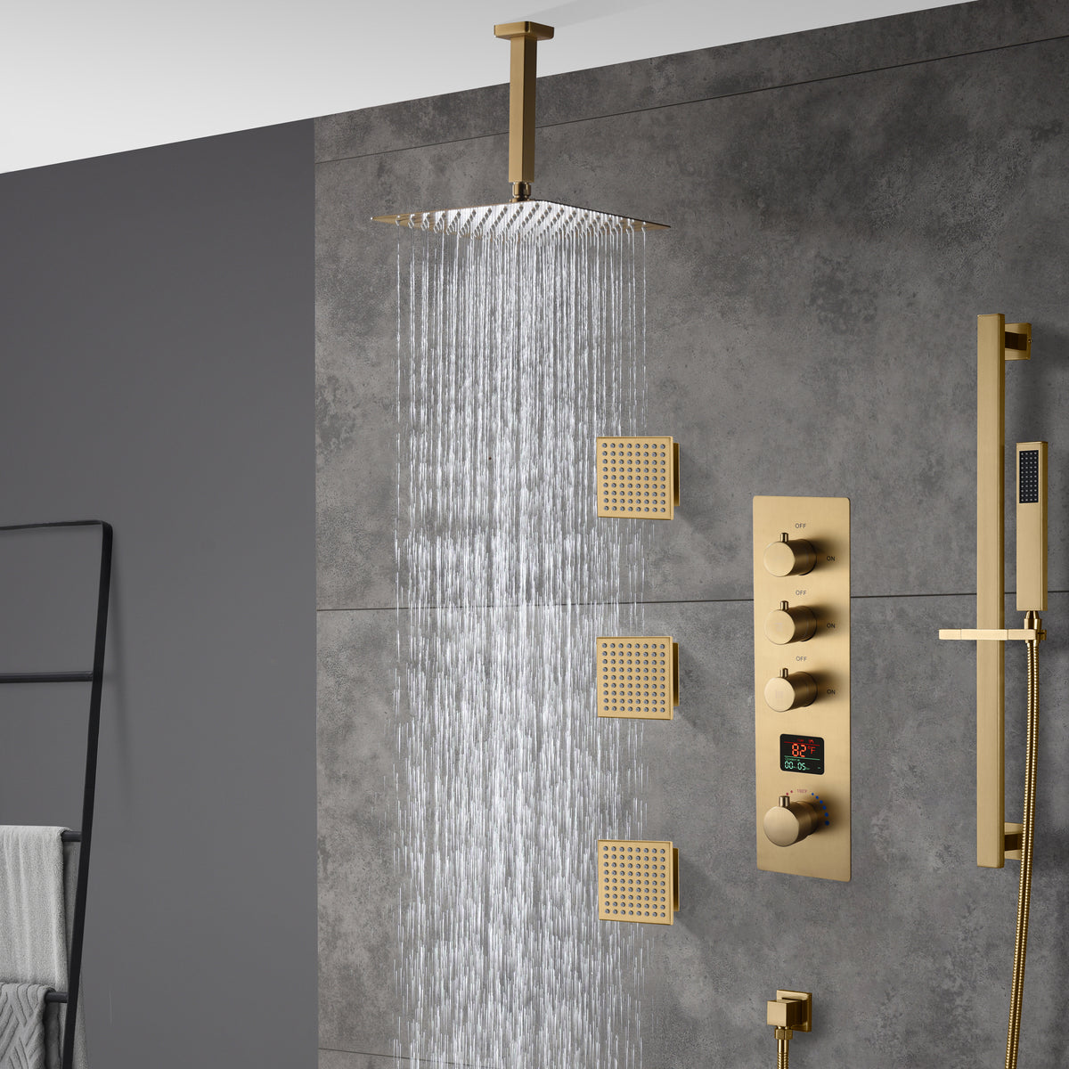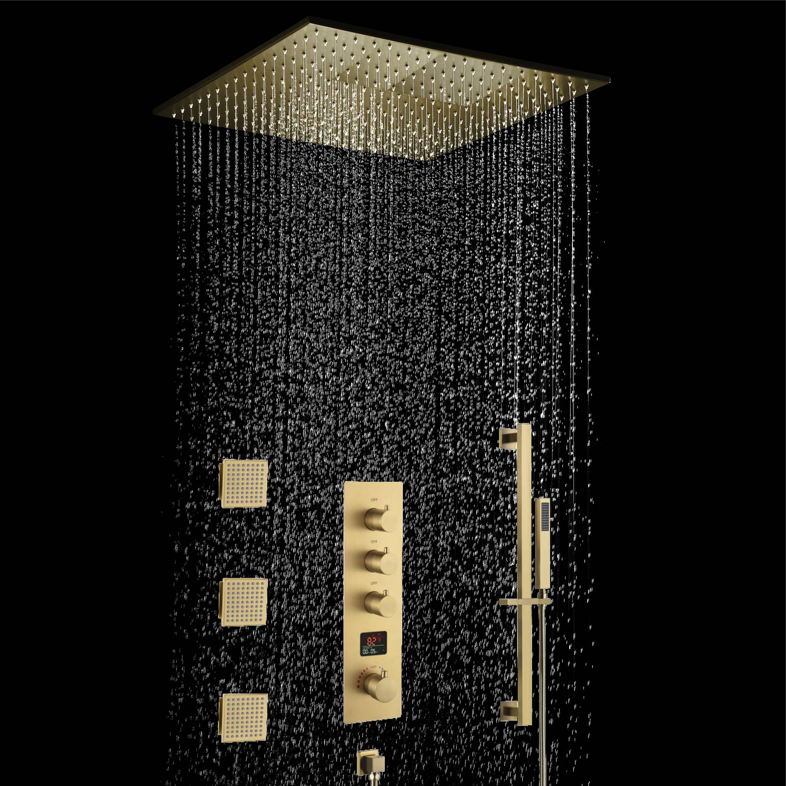 Brushed gold ceiling mount 12 inch or 16 inch or 20 inch rain head 3 way digital display thermostatic shower faucet with large body sprayers