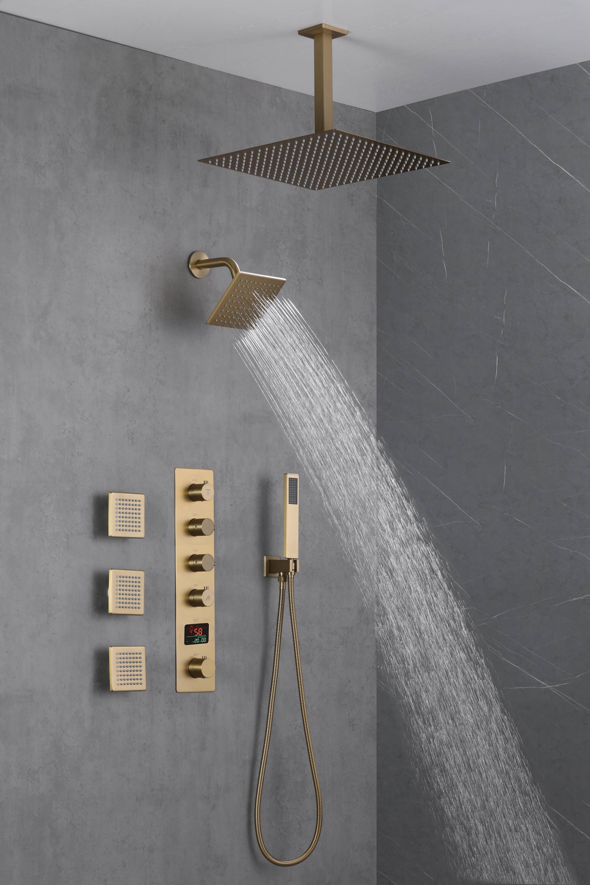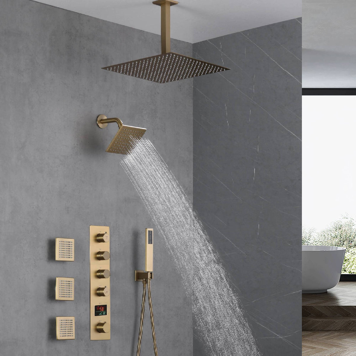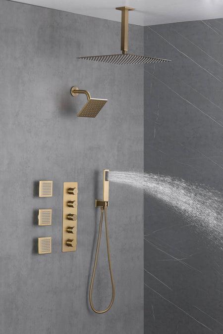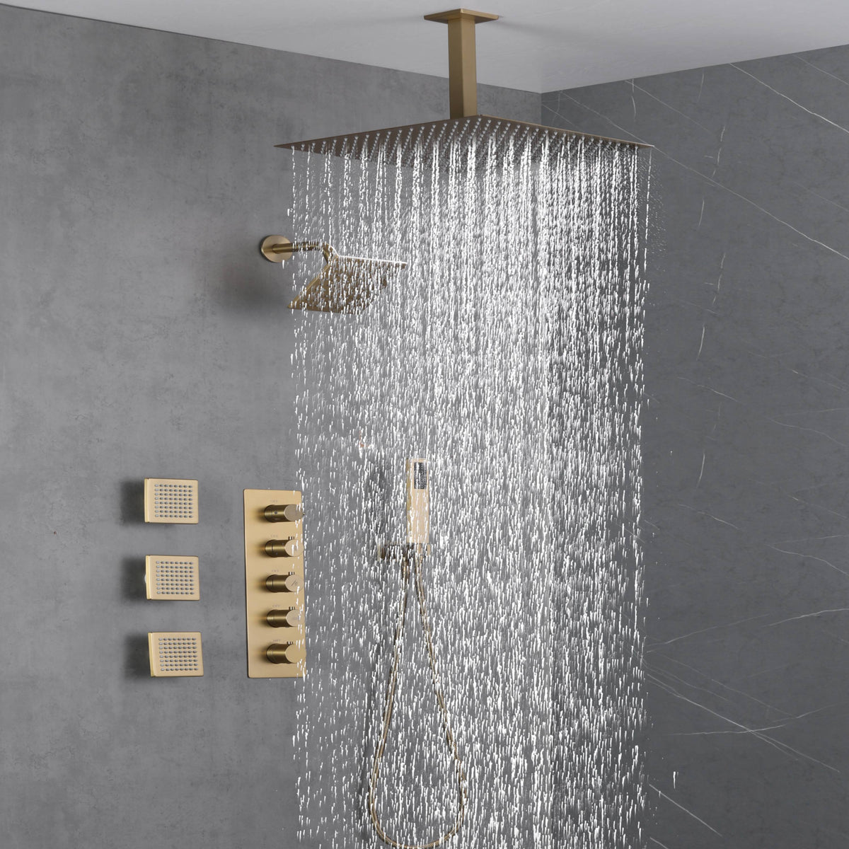 Brushed Gold 16-Inch Rainfall Ceiling Mount Shower Head with 4-Way Thermostatic Faucet, Body Jets, and High-Pressure Wall Mount Head