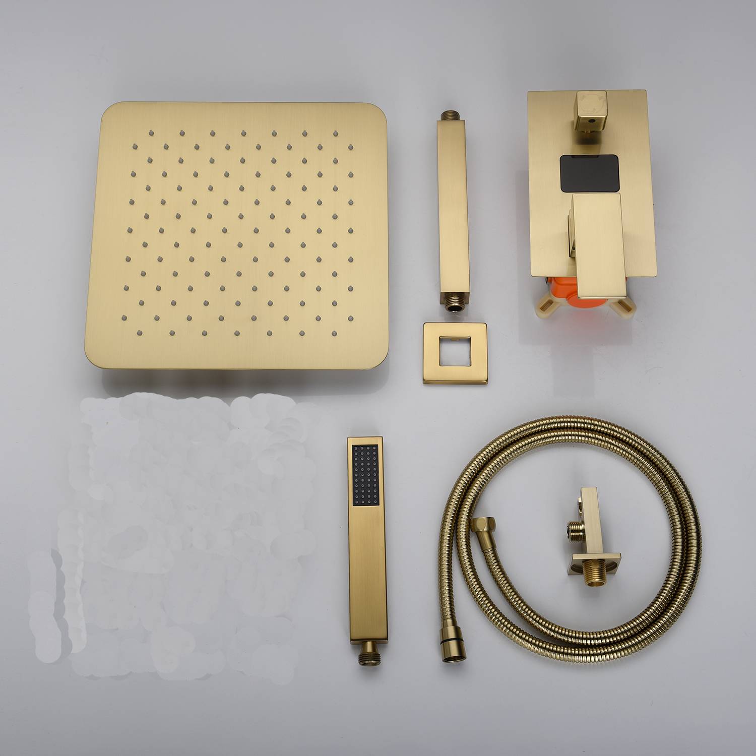 Presenting our Brushed Gold Shower System, crafted with high-quality materials that guarantees an opulent and refreshing shower experience. This system includes a brushed gold fixed shower head, a brass handheld holder, a 9.5” shower arm, a 59” shower hose, a 2-way digital display valve, a brass shower holder made of brass.