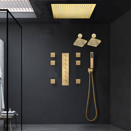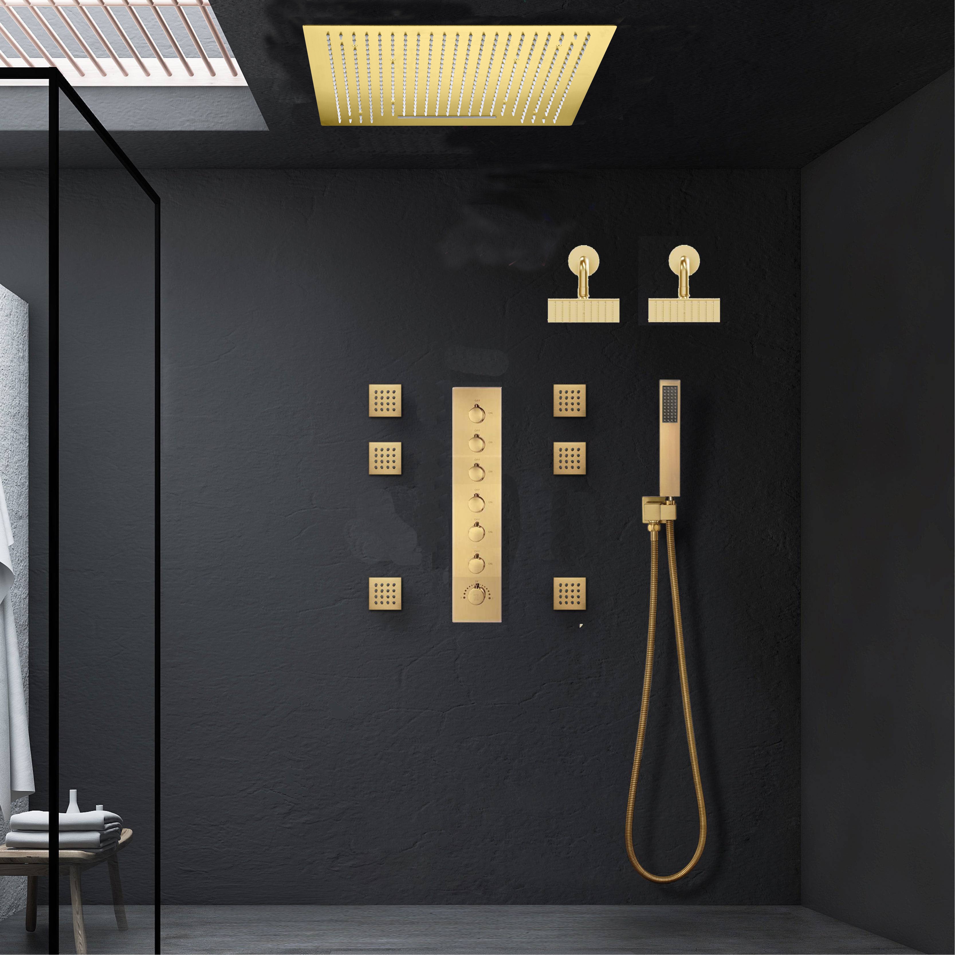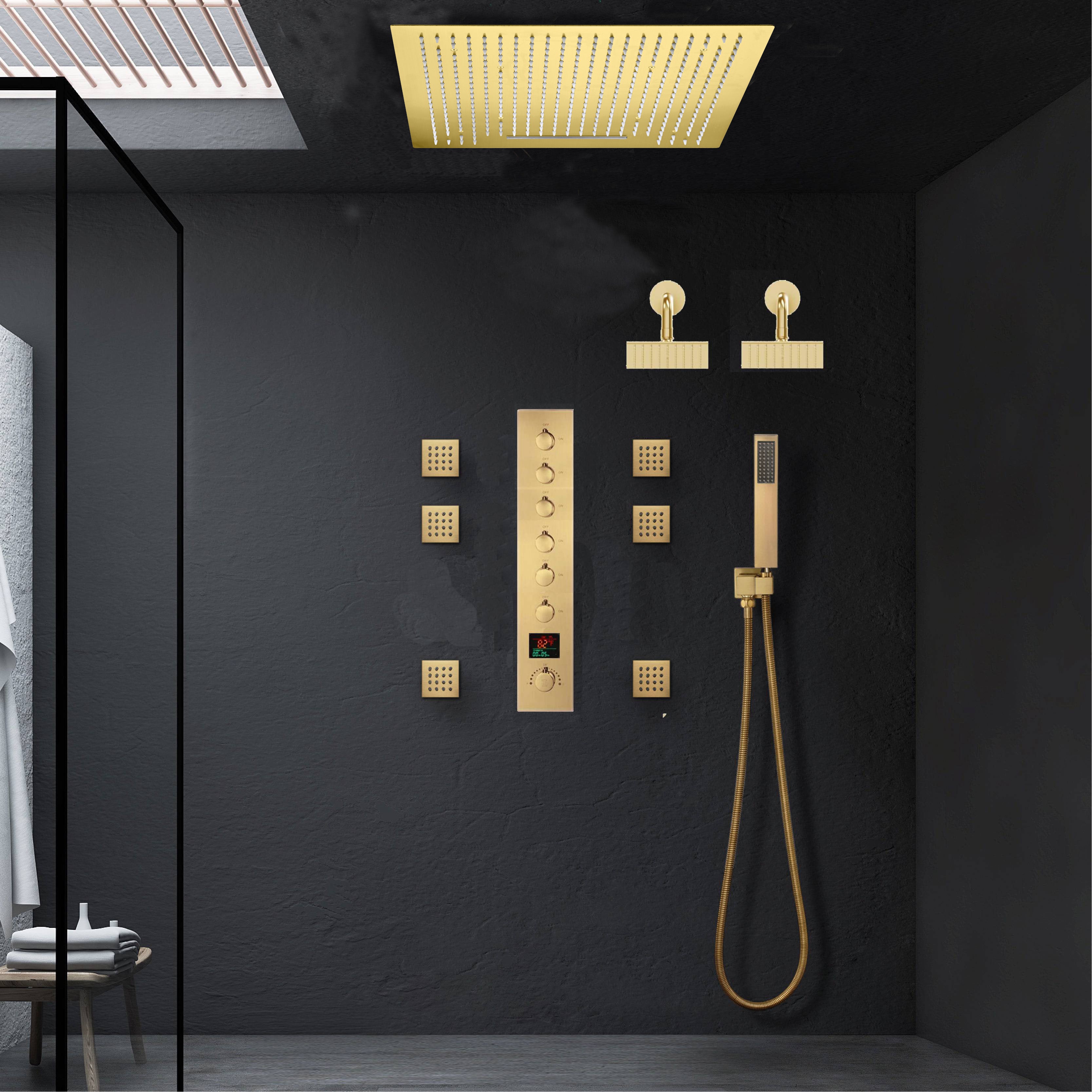 Brushed Gold Ceiling Mount 20'' Or 24'' rainfall waterfall Shower Head with 6-Way Digital Display Thermostatic Control, Dual Regular Heads & Body Sprayers