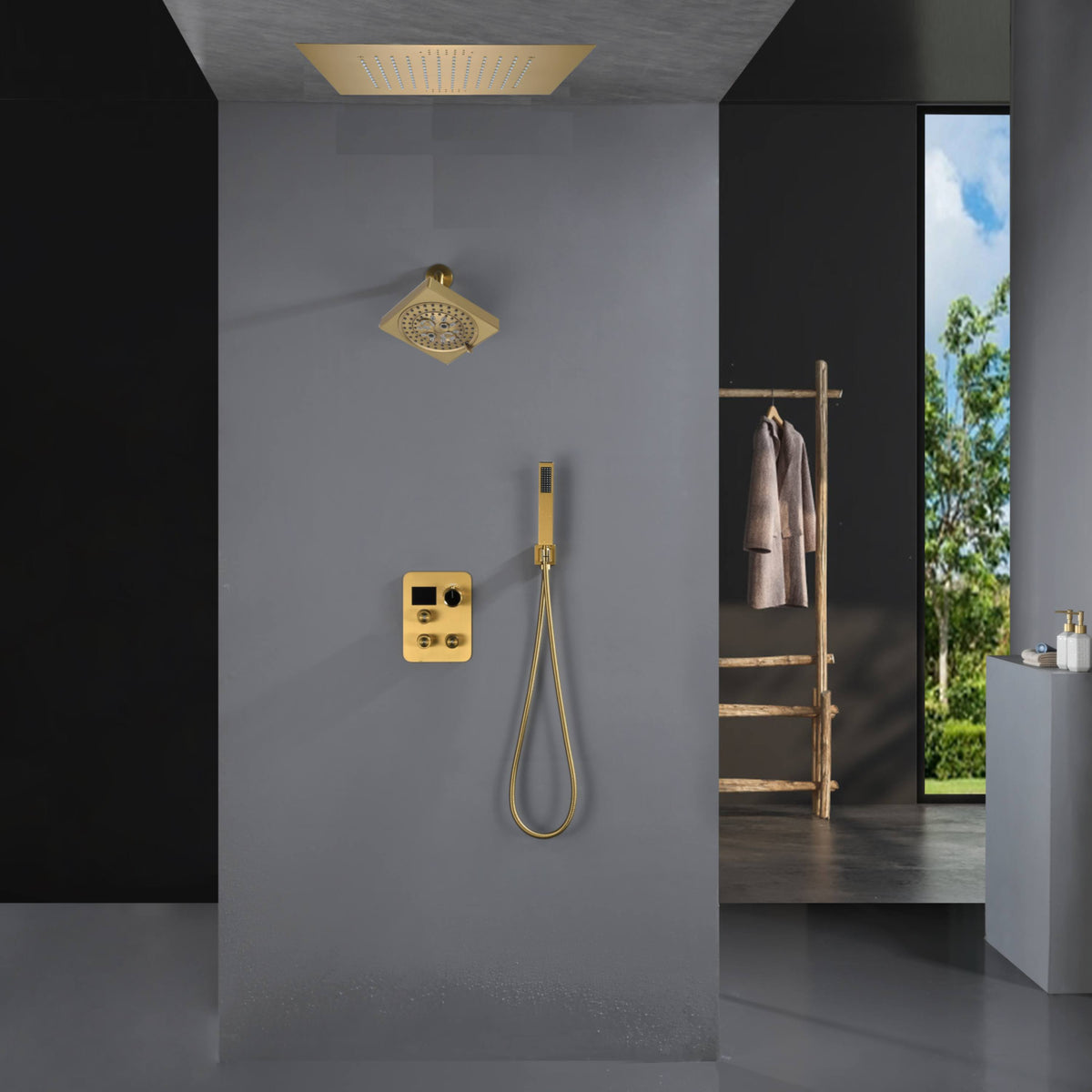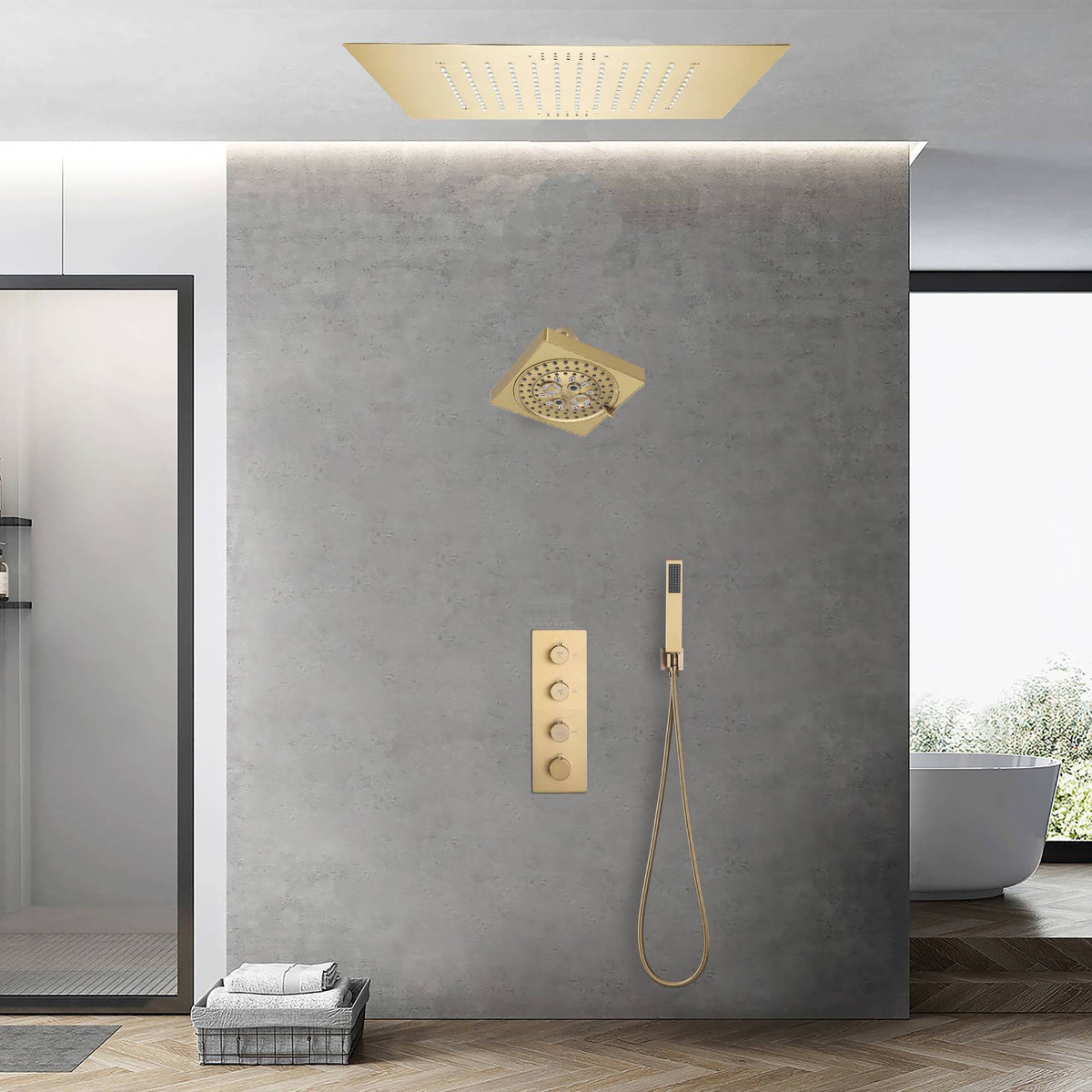 Brushed Gold 3-Way Thermostatic Shower Faucet with Optional Digital Display, 20-inch Flush-Mounted LED-Lit Bluetooth Music Shower Head and Regular Head