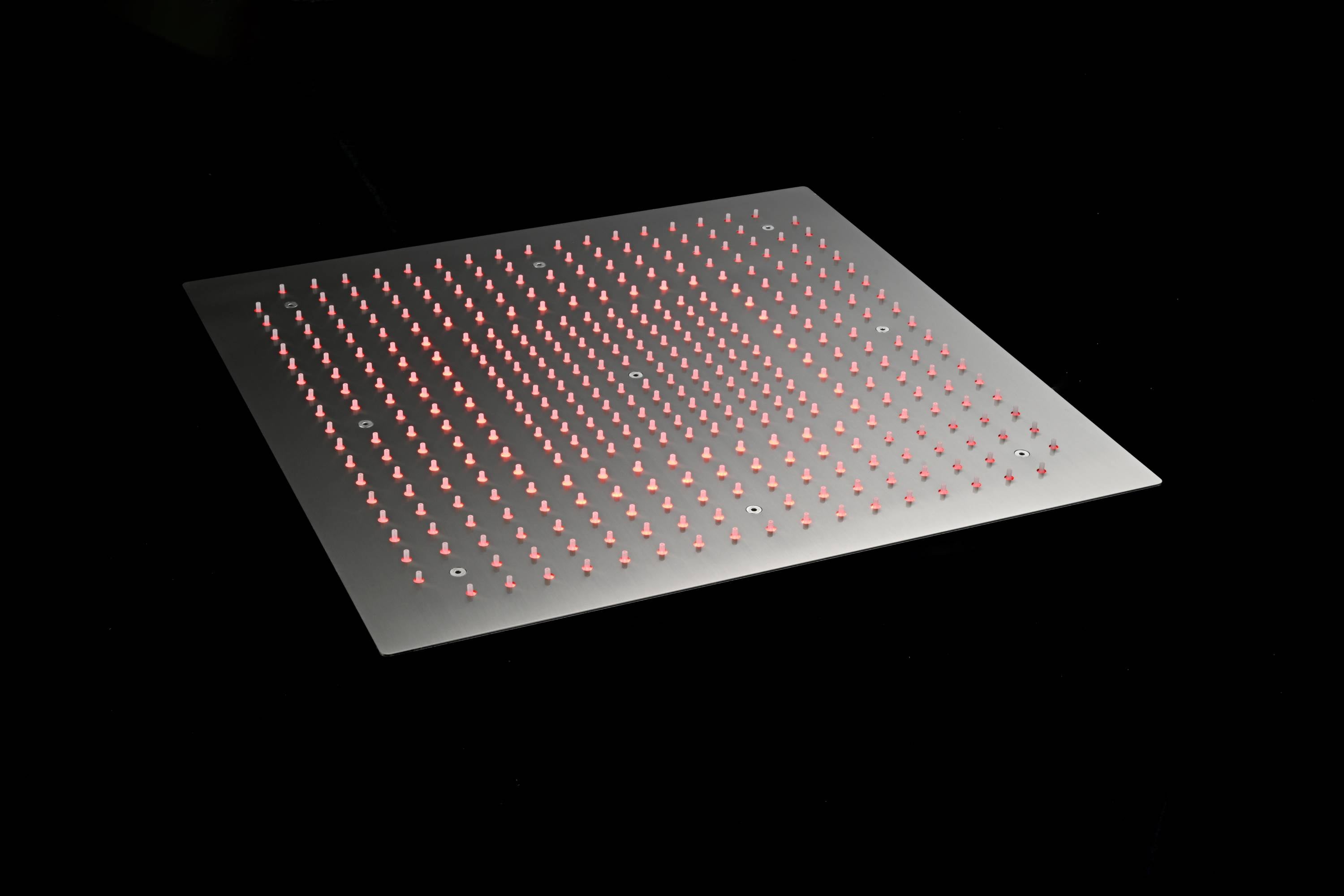 Choose from large rainfall shower heads in 24 x 24 inches, 20 x 20 inches, or 16 x 16 inches, each adorned with 64 LED lights. Control the lighting with a remote panel or touch panel, allowing you to personalize your shower experience with 64 vibrant colors. The remote panel is compatible with the 16-inch and 24-inch heads, while the touch panel works with the 20-inch head.