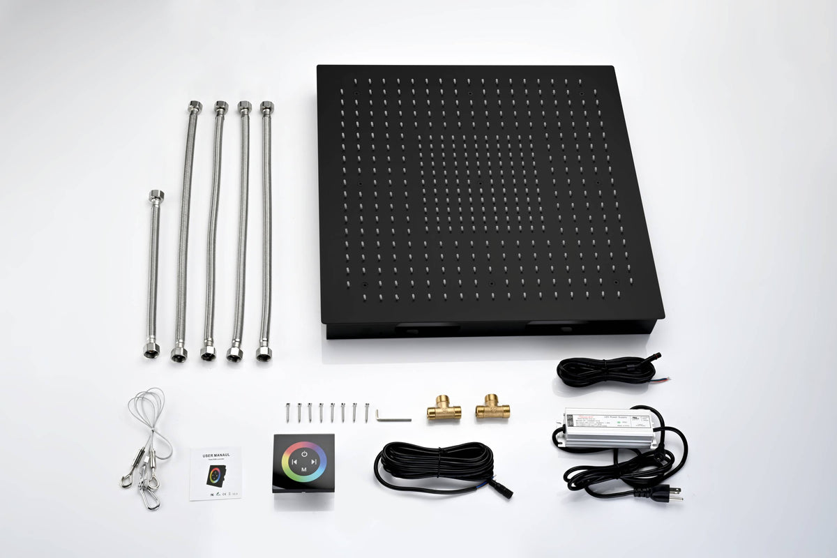 • 1 x 16-inch or 20-inch or 24-inch rainfall shower head (no music, with 64 LED lights)