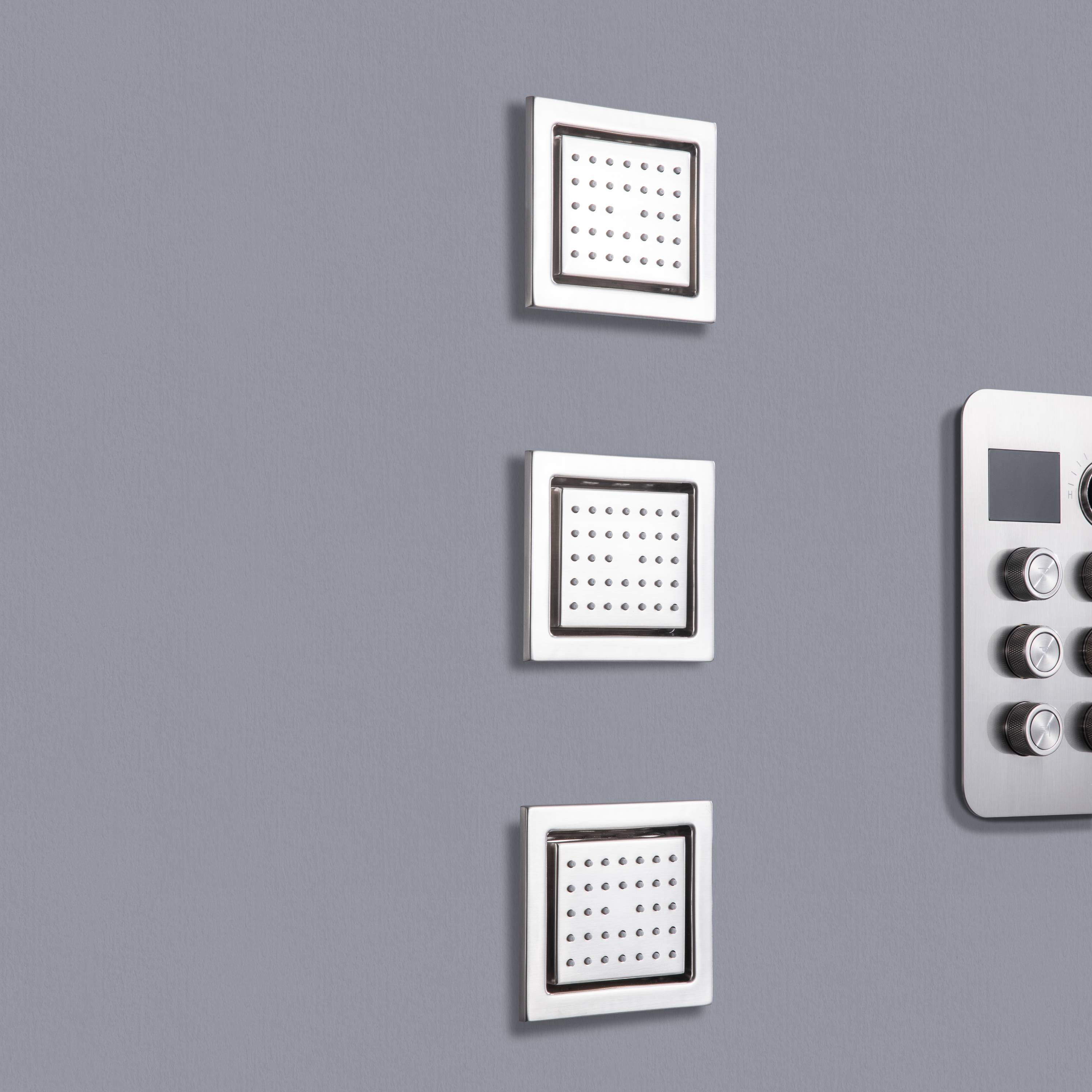 Built with all-metal components, this shower system features solid brass and stainless steel for exceptional durability. The shower head and 59-inch hose are made from 304 stainless steel, while the body jets, bracket holder, hand shower, and regular heads are crafted from brass. The design allows for flush ceiling mounting, with a slide-along flange on the shower arm for easy installation.