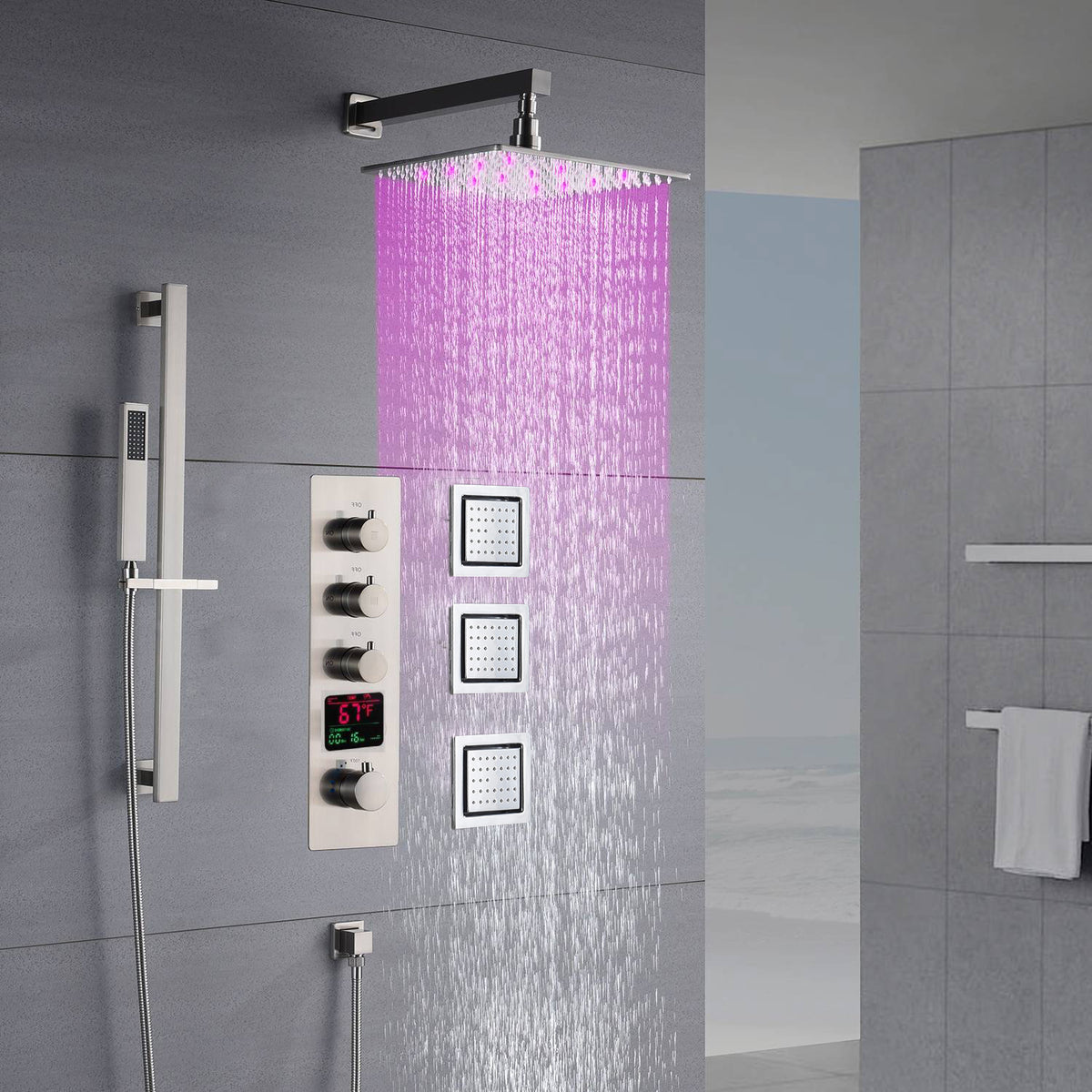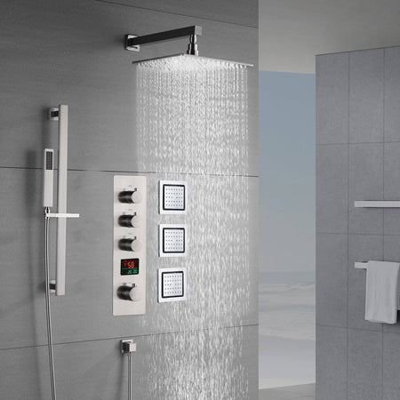 Brushed Nickel 12'' or 16'' Wall-Mounted Rain Shower System with 6 Body Jets and 3-Way DigitalDisplay Thermostatic Valve: Simultaneous and Independent Functionality