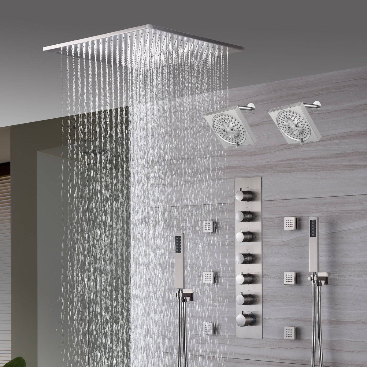 The package includes a pressure balancing thermostatic mixer valve and trim (brass), a top head, dual shower bracket holders (brass), a 59-inch shower hose (304 stainless steel), a handheld shower (brass), six adjustable body jets (brass), and two 6-inch regular heads (brass and stainless),dual handle wands;