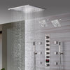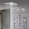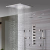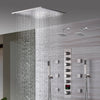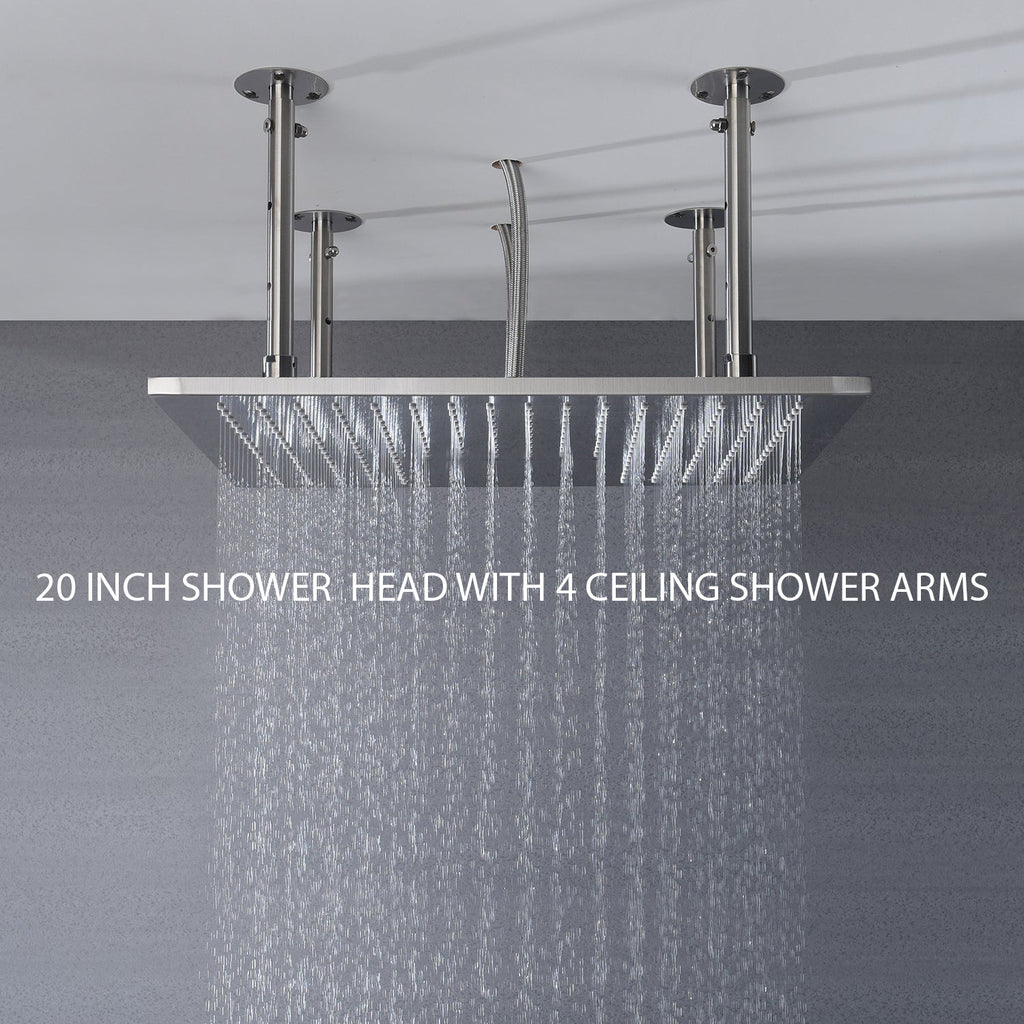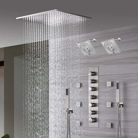 This shower system offers five functionalities: a rainfall shower, a body spray, dual handheld sprayers, a waterfall, and a regular head. All functions can operate simultaneously or separately, offering a tailored shower experience. The 20 x 20-inch shower head integrates a rainfall function and 64 LED lights. Manual operation controls the LED lights, which are powered electronically.