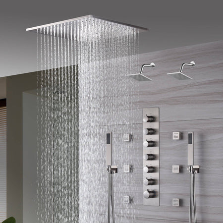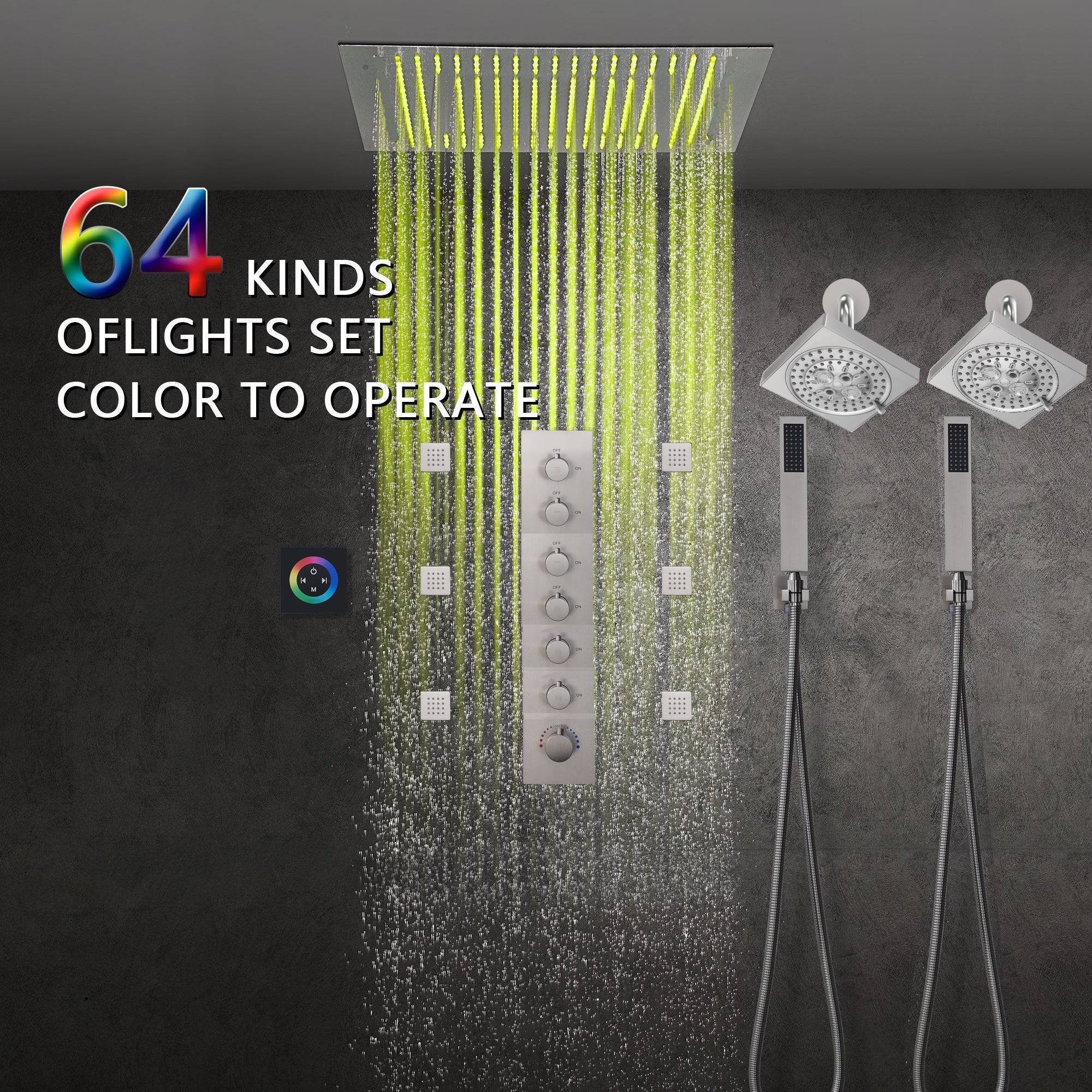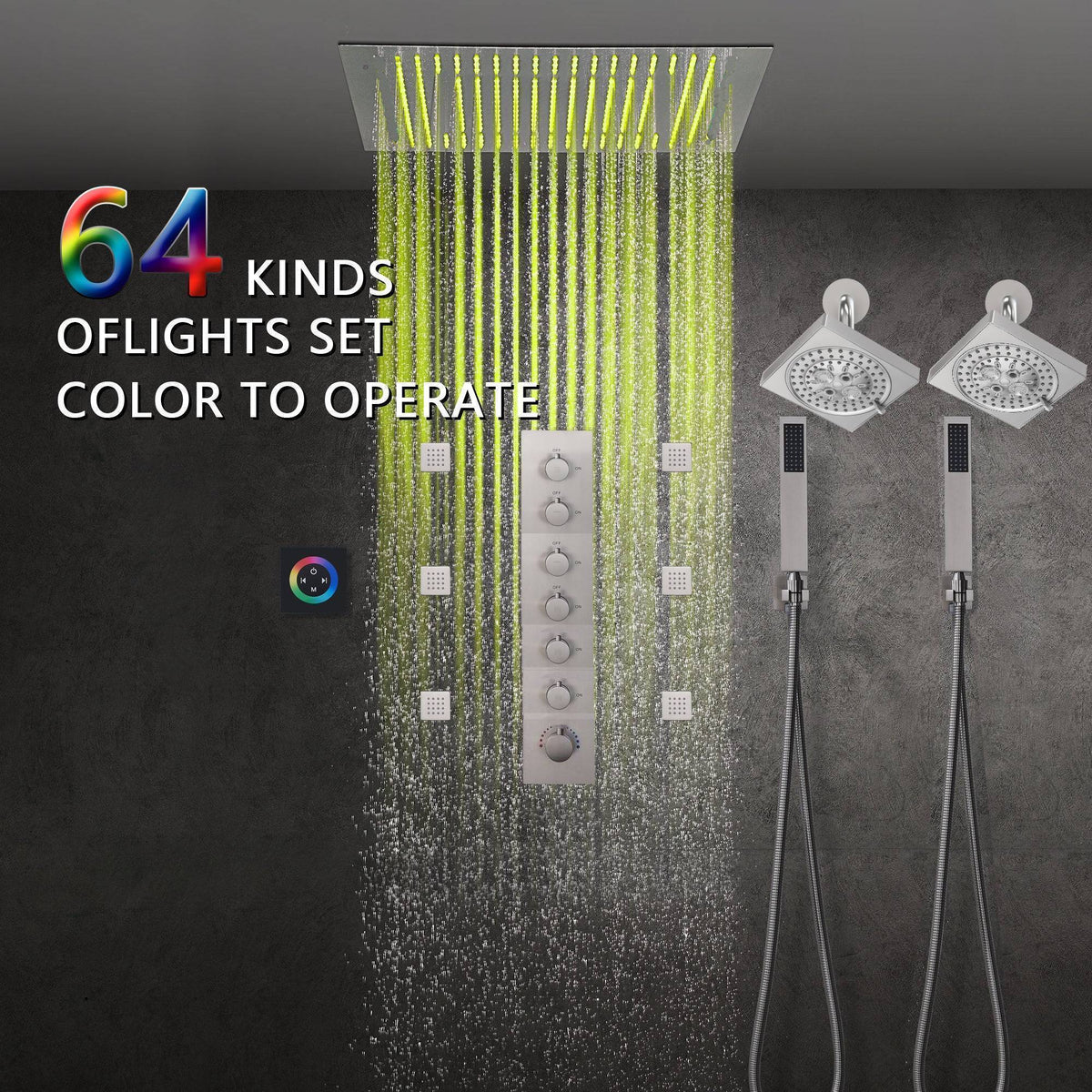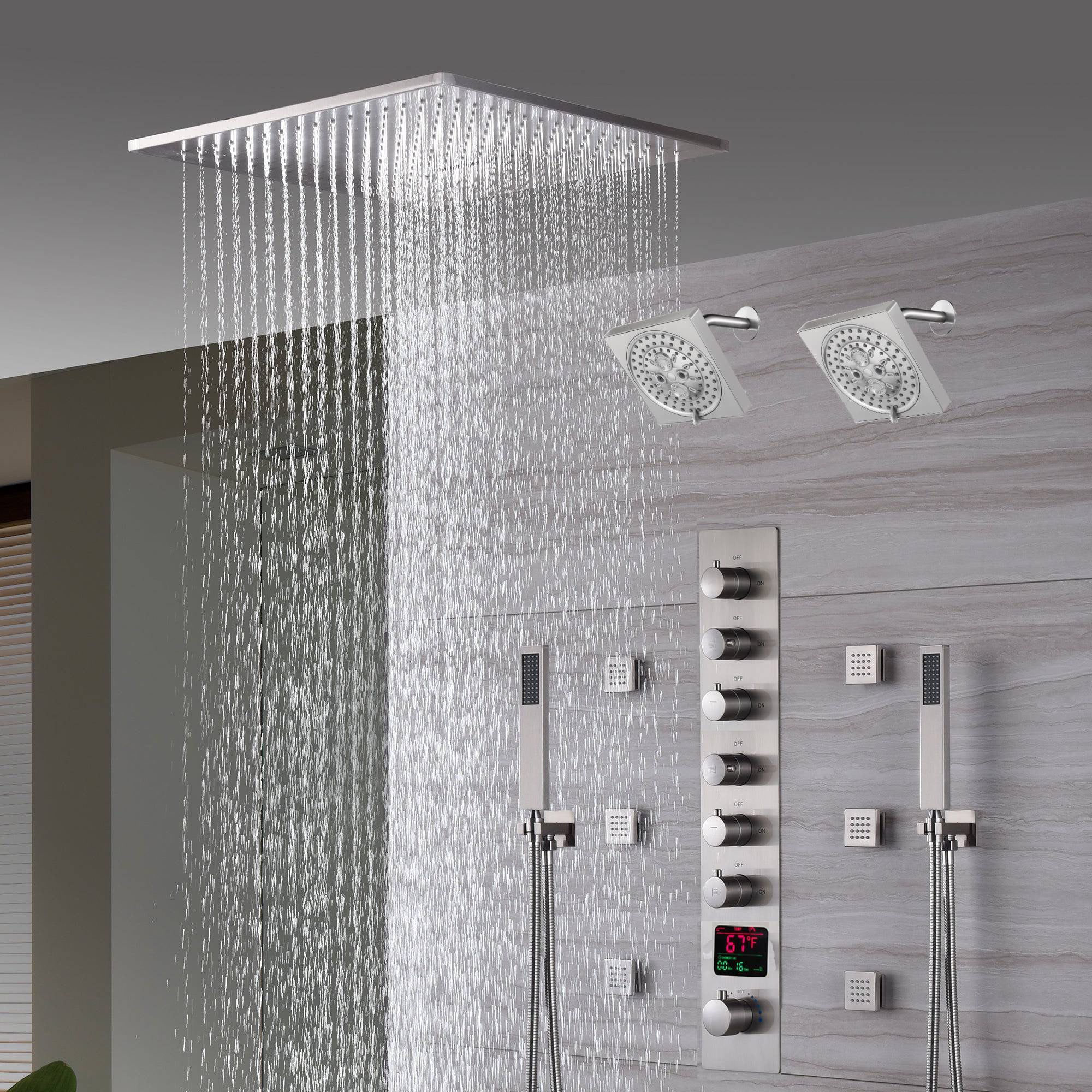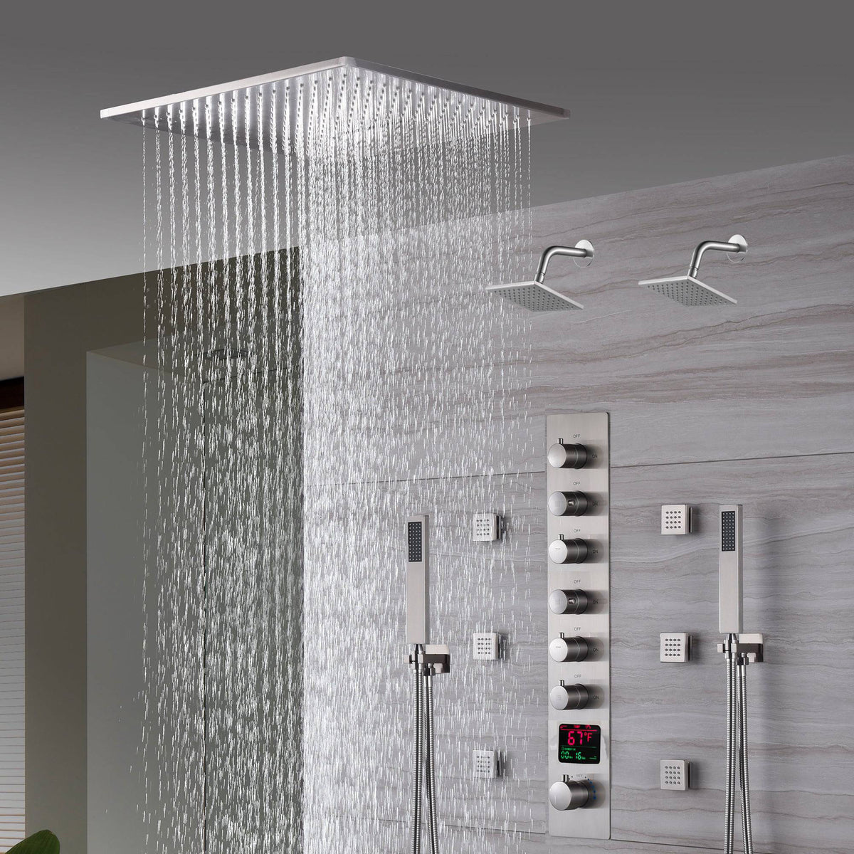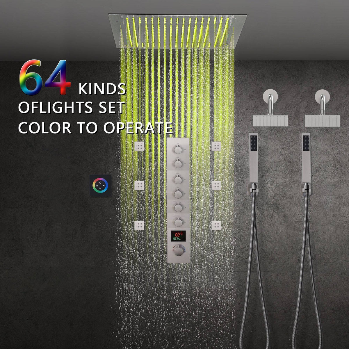 Brushed Nickel 6-Way Digital Thermostatic Shower Faucet: 20" Rainfall Head with LED Lights, Regular Head, 6 Body Jets