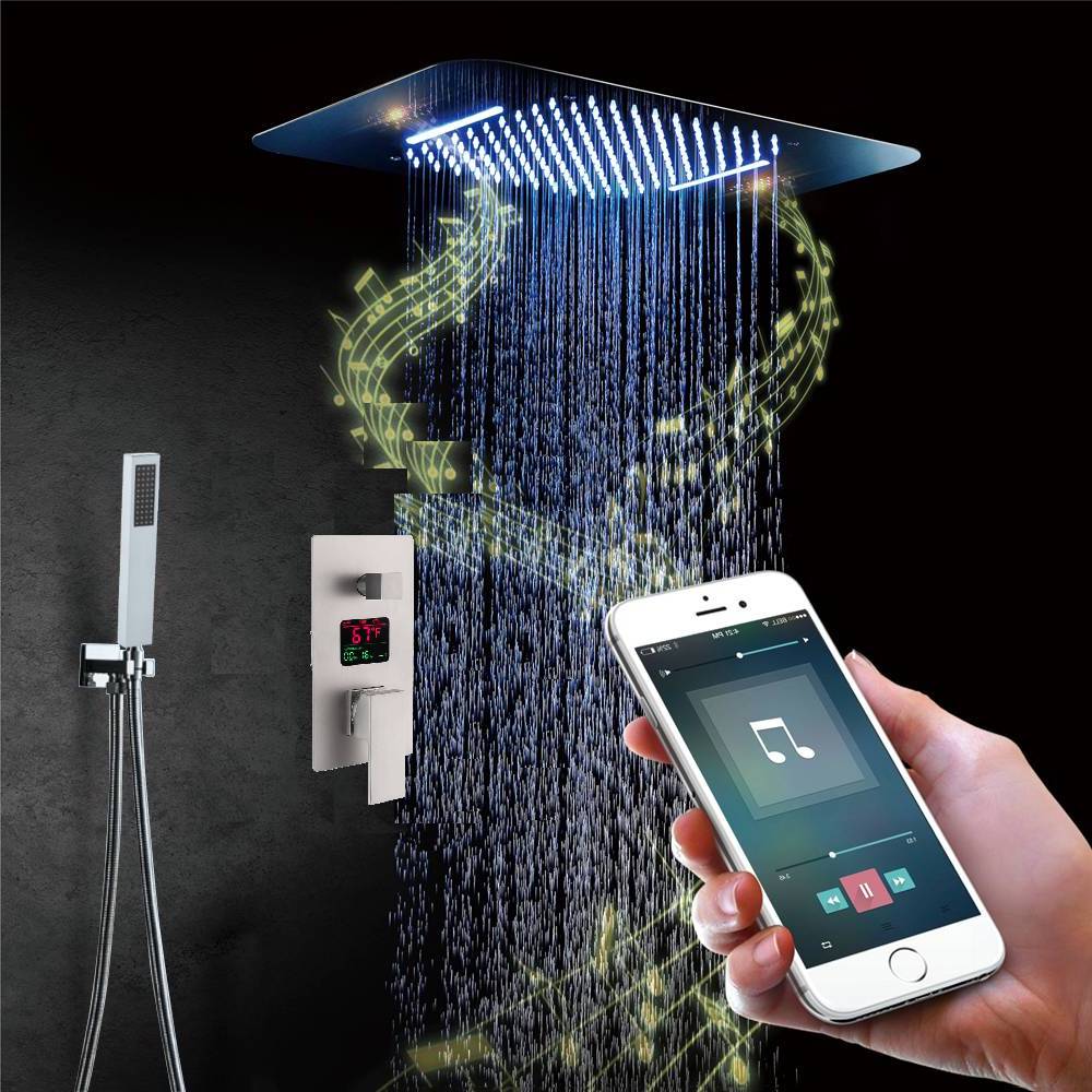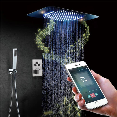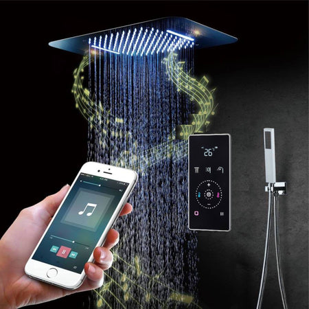 Rainfall Waterfall Head: The 23" LED Bluetooth Music stainless rainfall waterfall head offers a soothing shower experience. With flush mount ceiling installation, it integrates LED, mist, and rainfall functionalities. Control the LED light with a remote panel control, and manage music through your cell phone for a personalized shower experience.