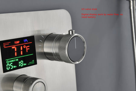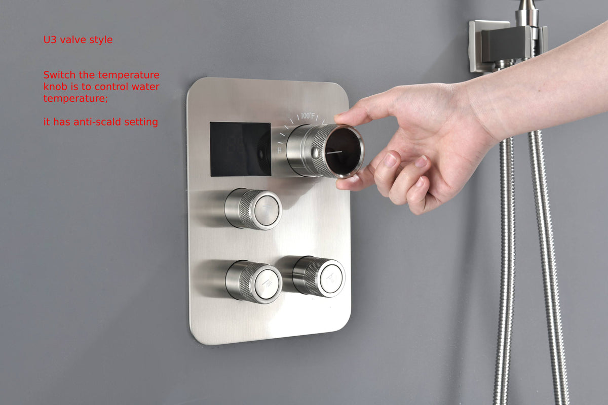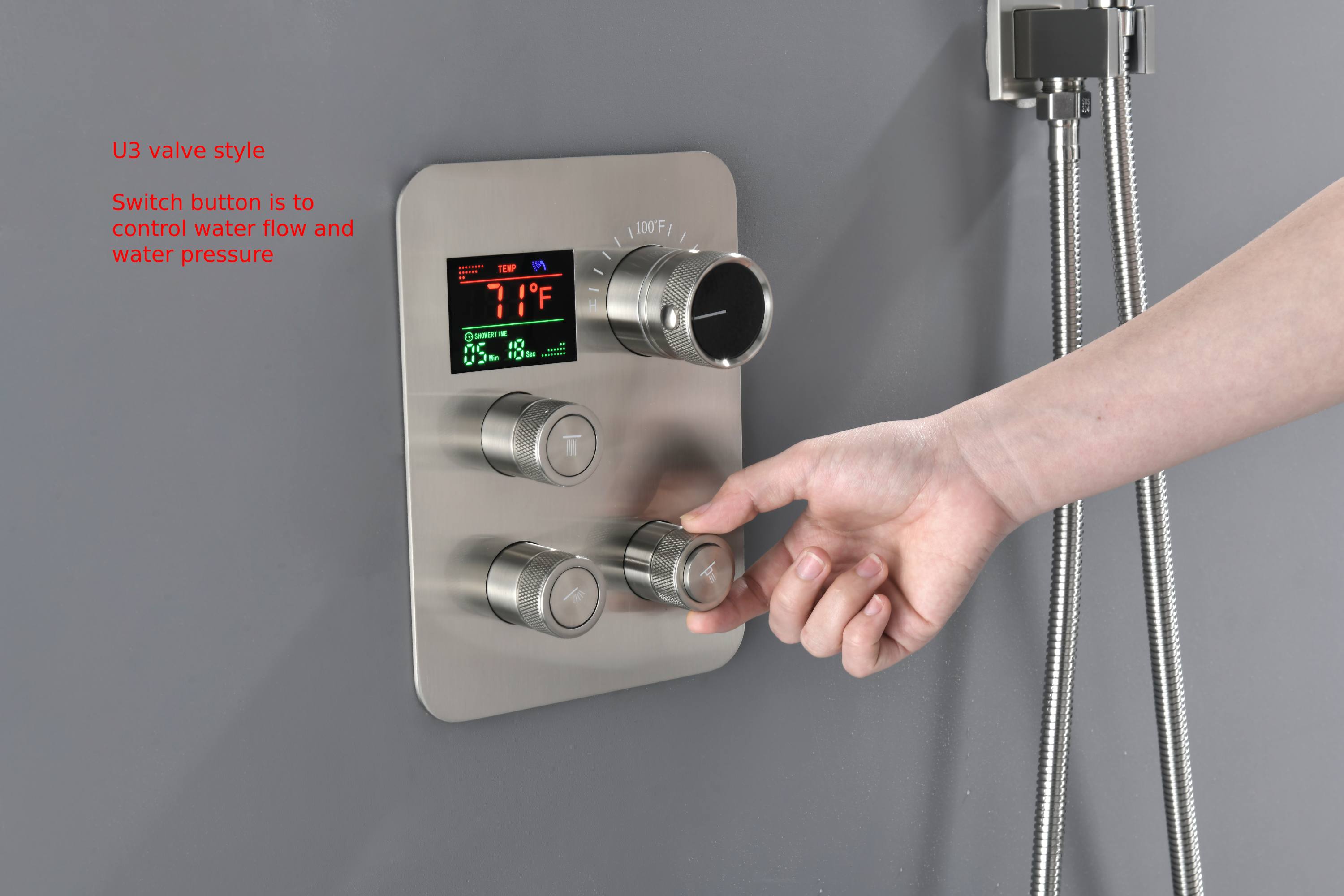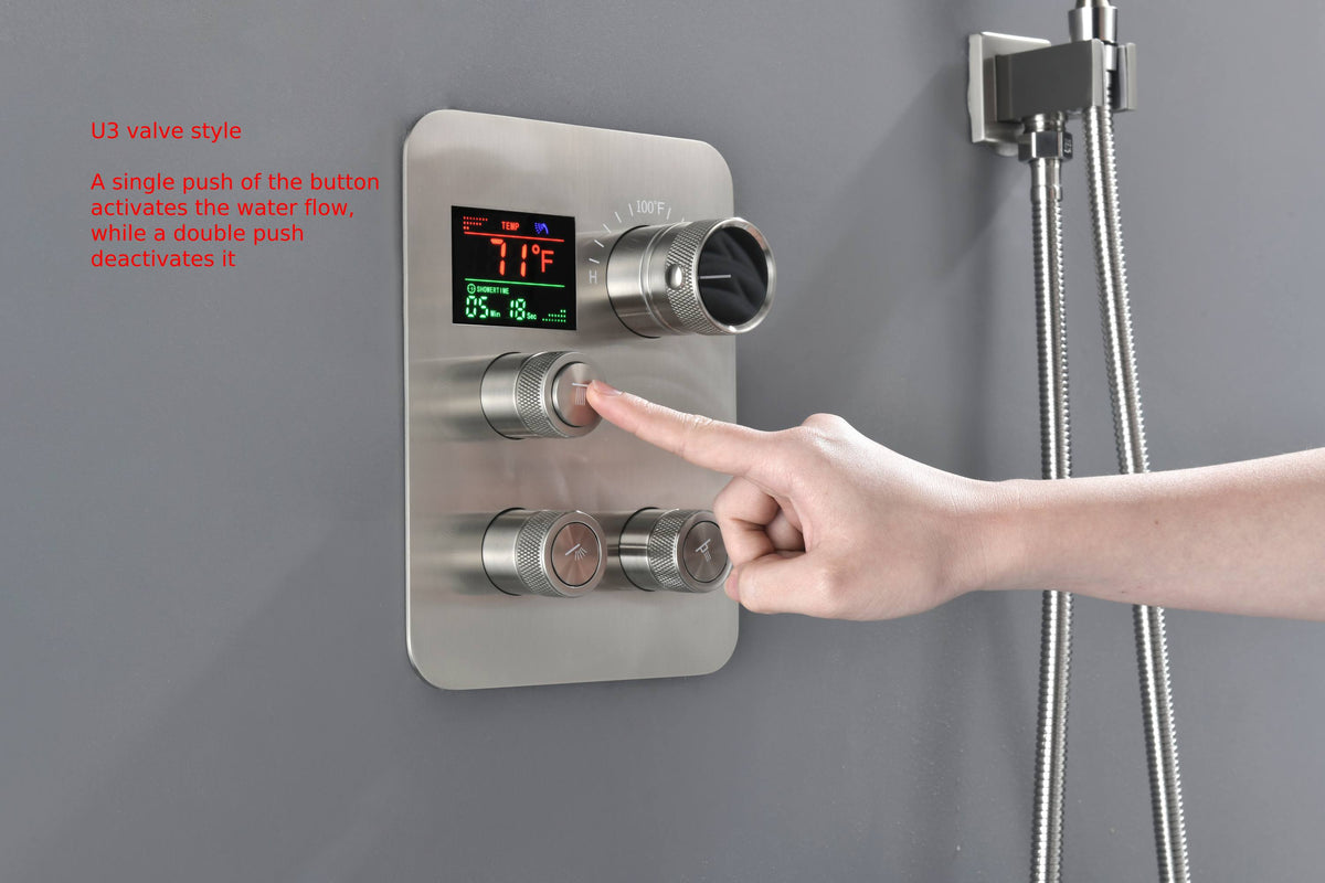 Style U3: Combines precise control and modern tech. Features three diverter knobs for water flow and pressure, and a thermostatic cartridge-controlled temperature knob. Each function can operate together or separately. Includes a battery-free, water flow-operated digital display.The product features 3/4 inch inlets and outlets, necessitating the use of 3/4 inch or 1/2 inch hot and cold water pipelines, while all other pipelines are also sized at 1/2 inch, and it offers a water flow range of 1.5 to 7.8 GPM.
