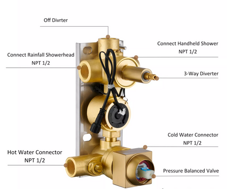 Style Q3: Combines precise control and modern tech. Features three diverter knobs for water flow and pressure, and a thermostatic cartridge-controlled temperature knob. Each function can operate together or separately. Includes a battery-free, water flow-operated digital display.The product features 1/2 inch inlets and outlets, necessitating the use of 1/2 inch hot and cold water pipelines, while all other pipelines are also sized at 1/2 inch, and it offers a water flow range of 1.5 to 5.8 GPM.