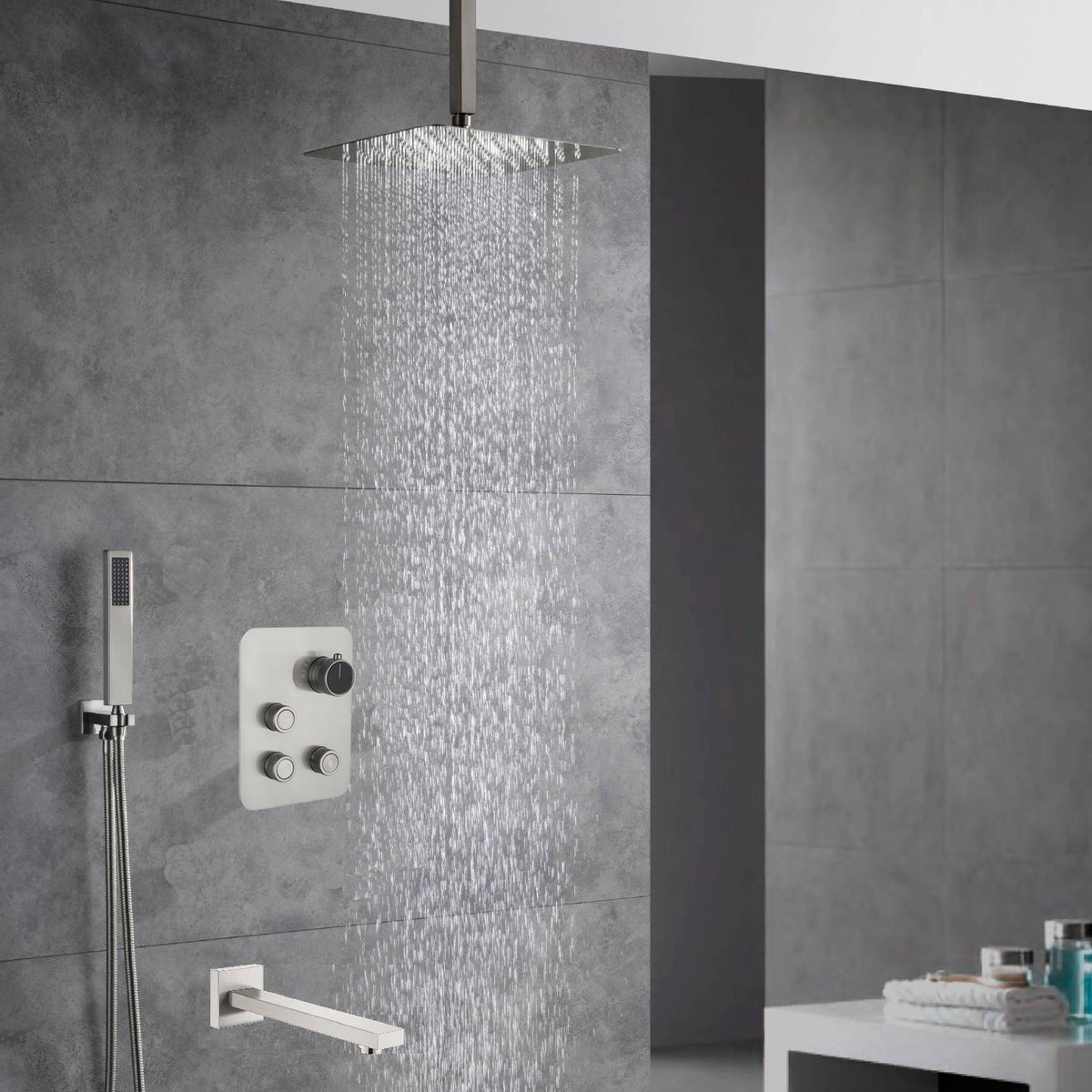 Brushed Nickel Ceiling Mount 3-Way Thermostatic Shower Valve System with Tub Spout