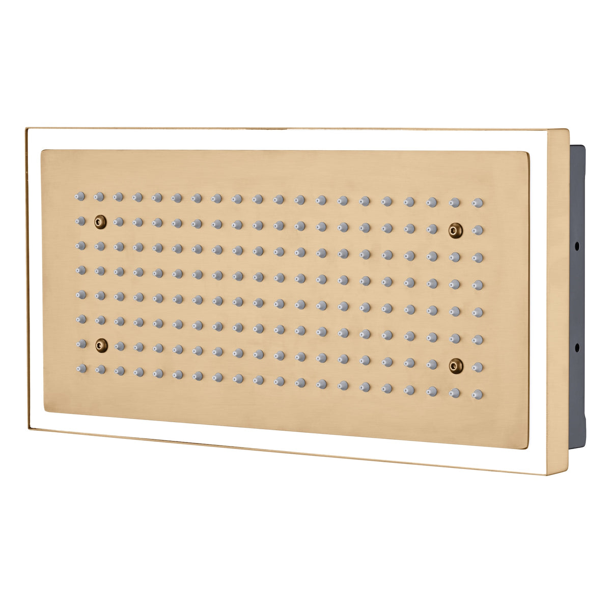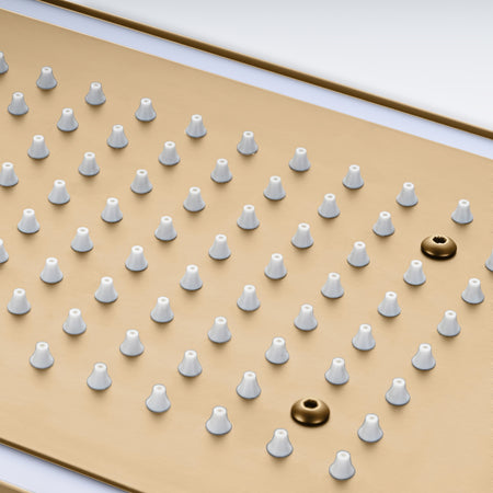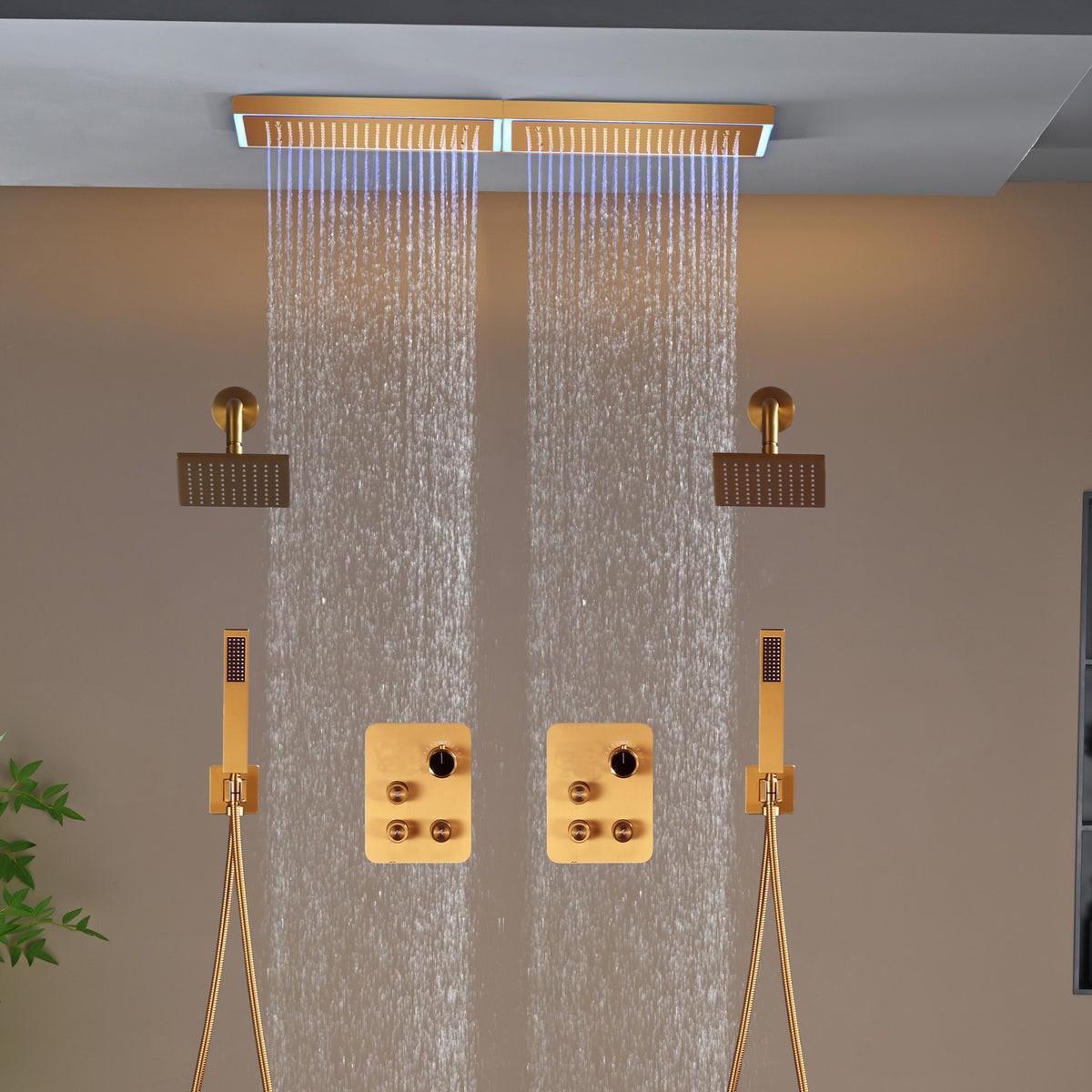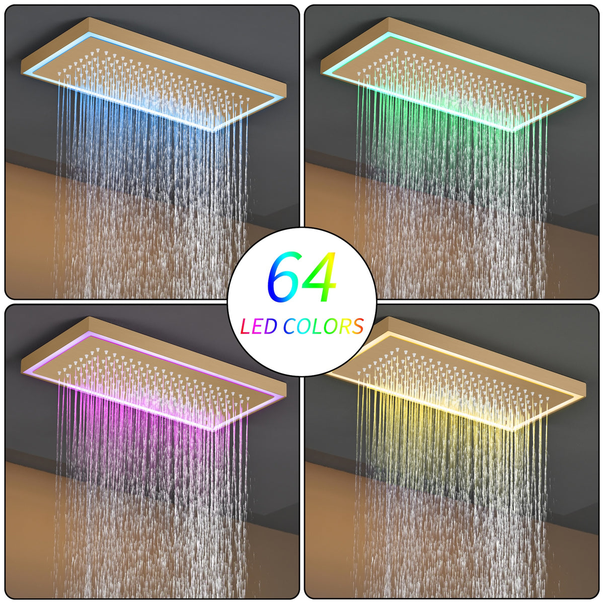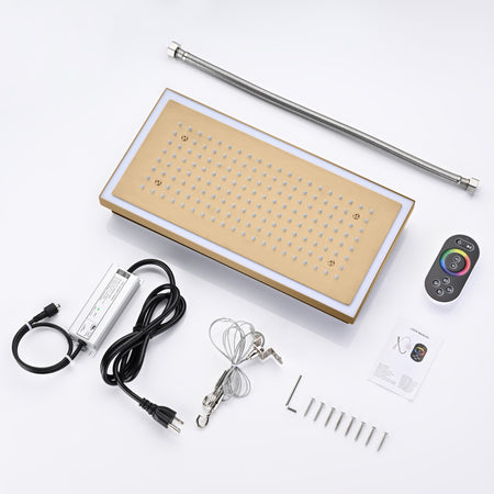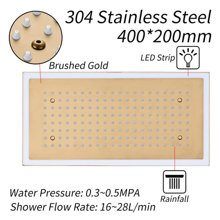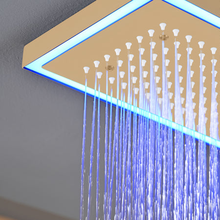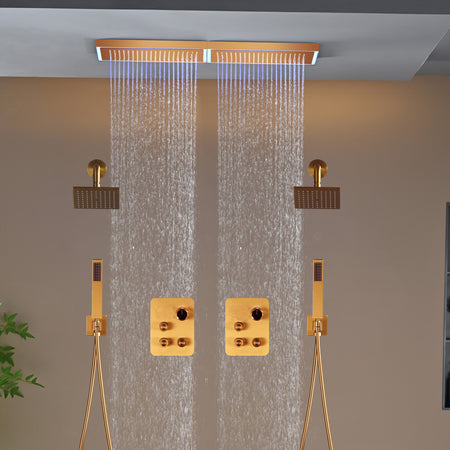 Champagne Bronze Flush Mount 32 x 8 inch Rainfall 64 LED Light Shower Head with 6-Way Thermostatic Faucet and High-Pressure Dual Regular Heads