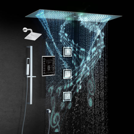 Chrome 35" Bluetooth Music LED Shower System with Waterfall, 6-Way Touch Digital Thermostatic Valve, 3 Body Jets, Regular Head