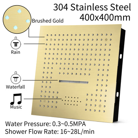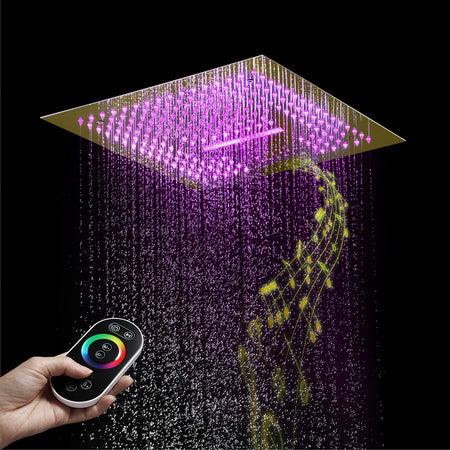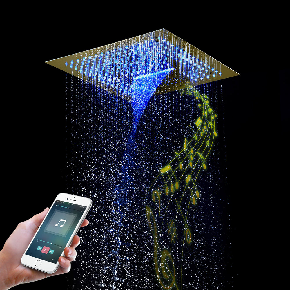 1. 16x16 inch Stainless Steel Rainfall Waterfall Shower Head: Wit;h bluetooth music and 64 LED lights and remote panel control led light and your cell phone control music