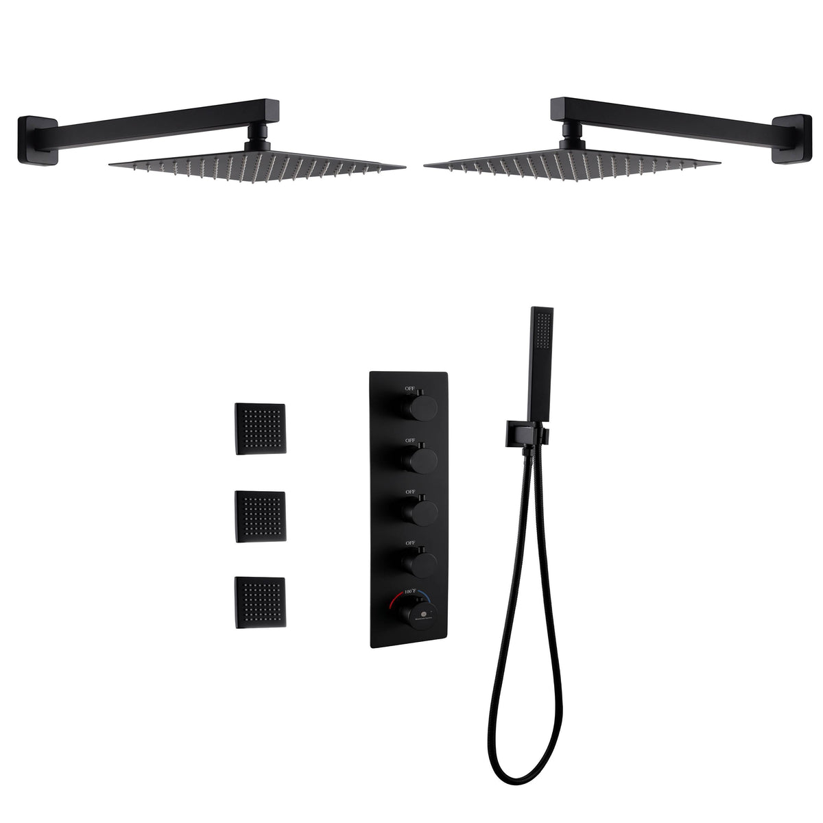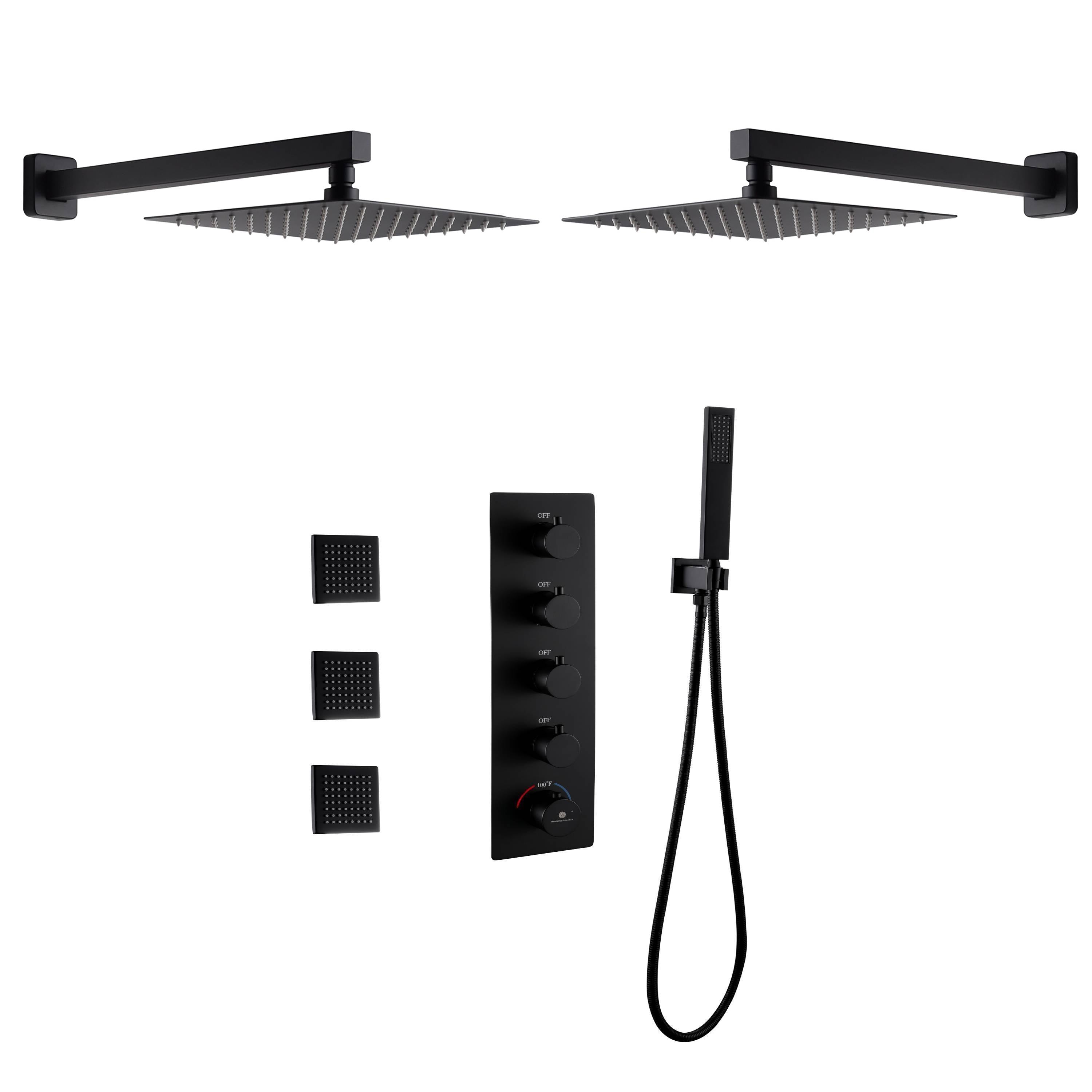 Wall mount 12 inch or 16 inch matte black rainfall shower system 4 way thermostatic rough in valve with body jets