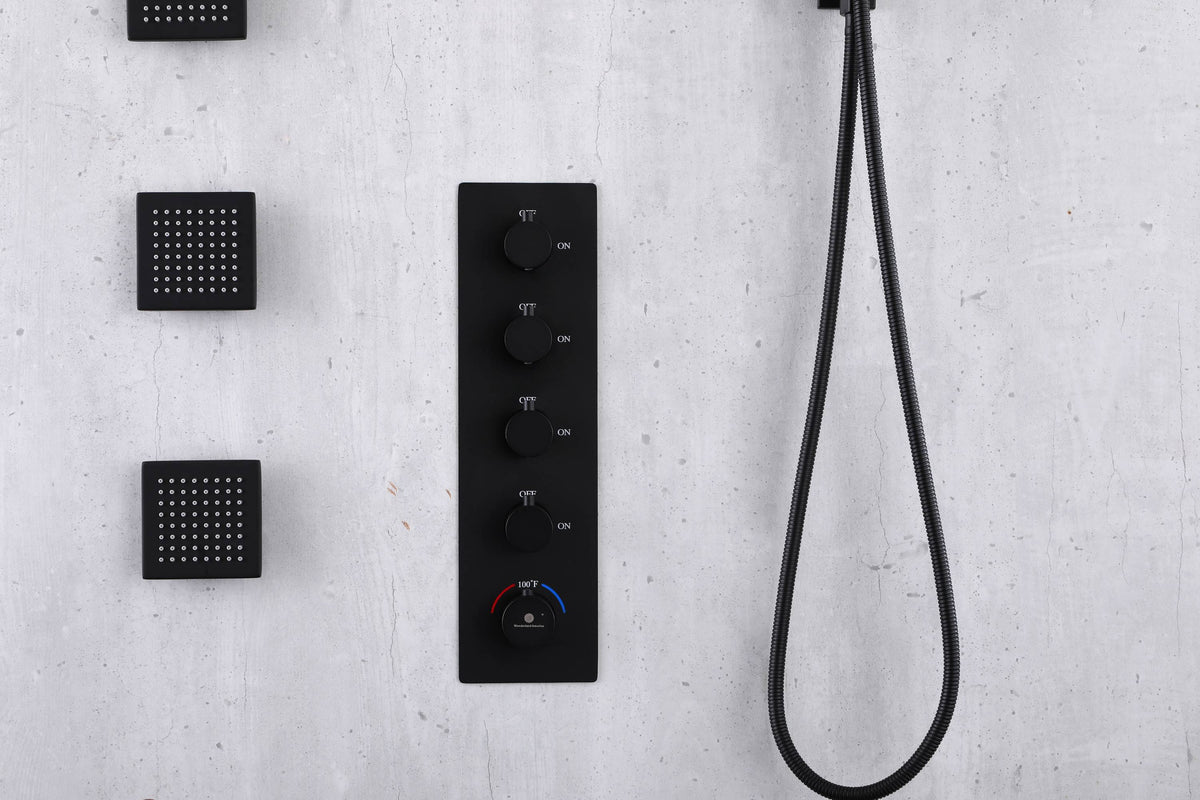 This 4-way thermostatic shower system in matte black offers a luxurious and customizable shower experience. Its various components, including a rainfall shower head, a handheld shower, body jets, and a thermostatic control valve, allow for a personalized showering experience. The system's sleek matte black finish adds a modern touch to any bathroom.