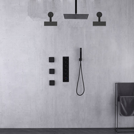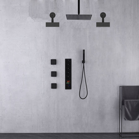 Matte Black Rainfall Shower System: 12" or 16" with 5-Way Thermostatic Valve, Body Jets
