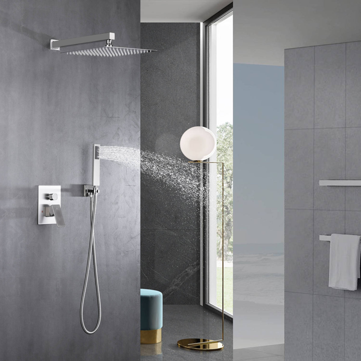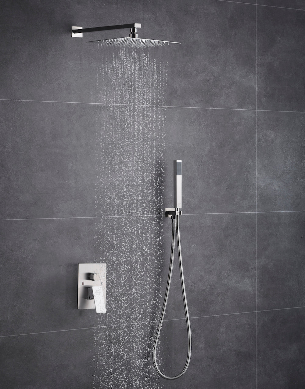 Shower Head: Choose between a 12x12 inch or a 16x16 inch rainfall shower head. The shower head also comes in two options: a version without LED lights and one with LED lights powered by water flow, eliminating the need for batteries.