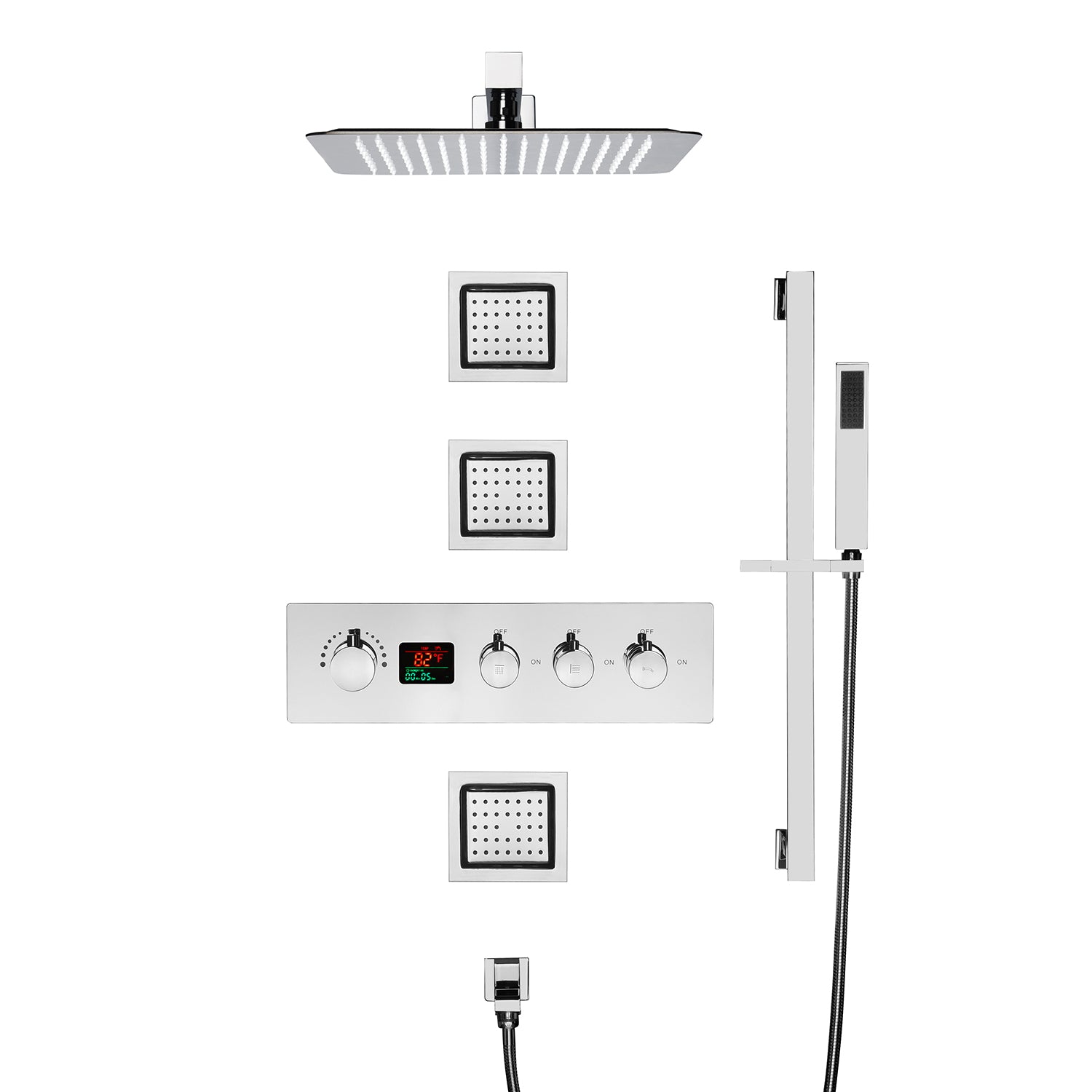 12inch Wall mount 3 way digital thermostatic shower faucet with sliding bar and 4inch body jets