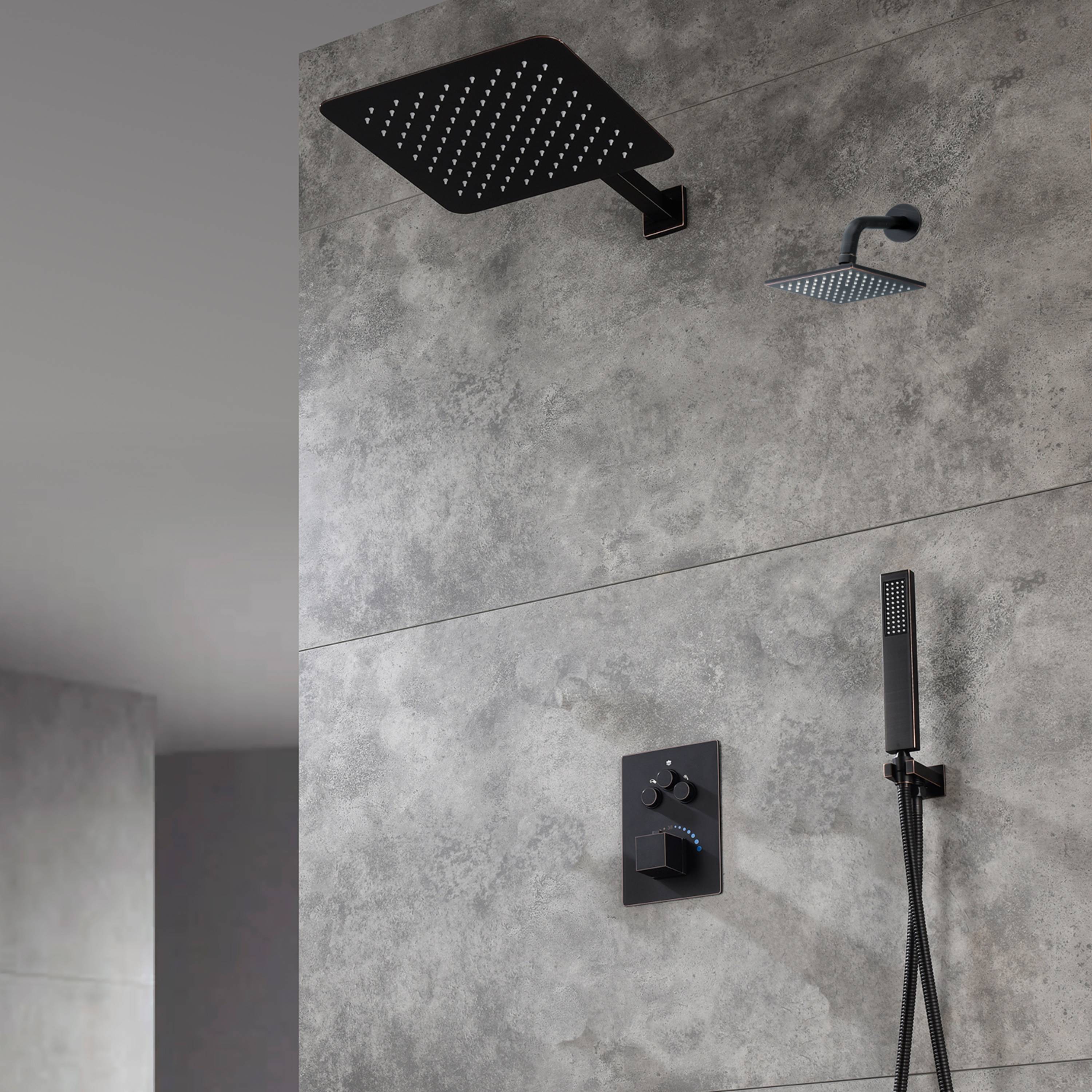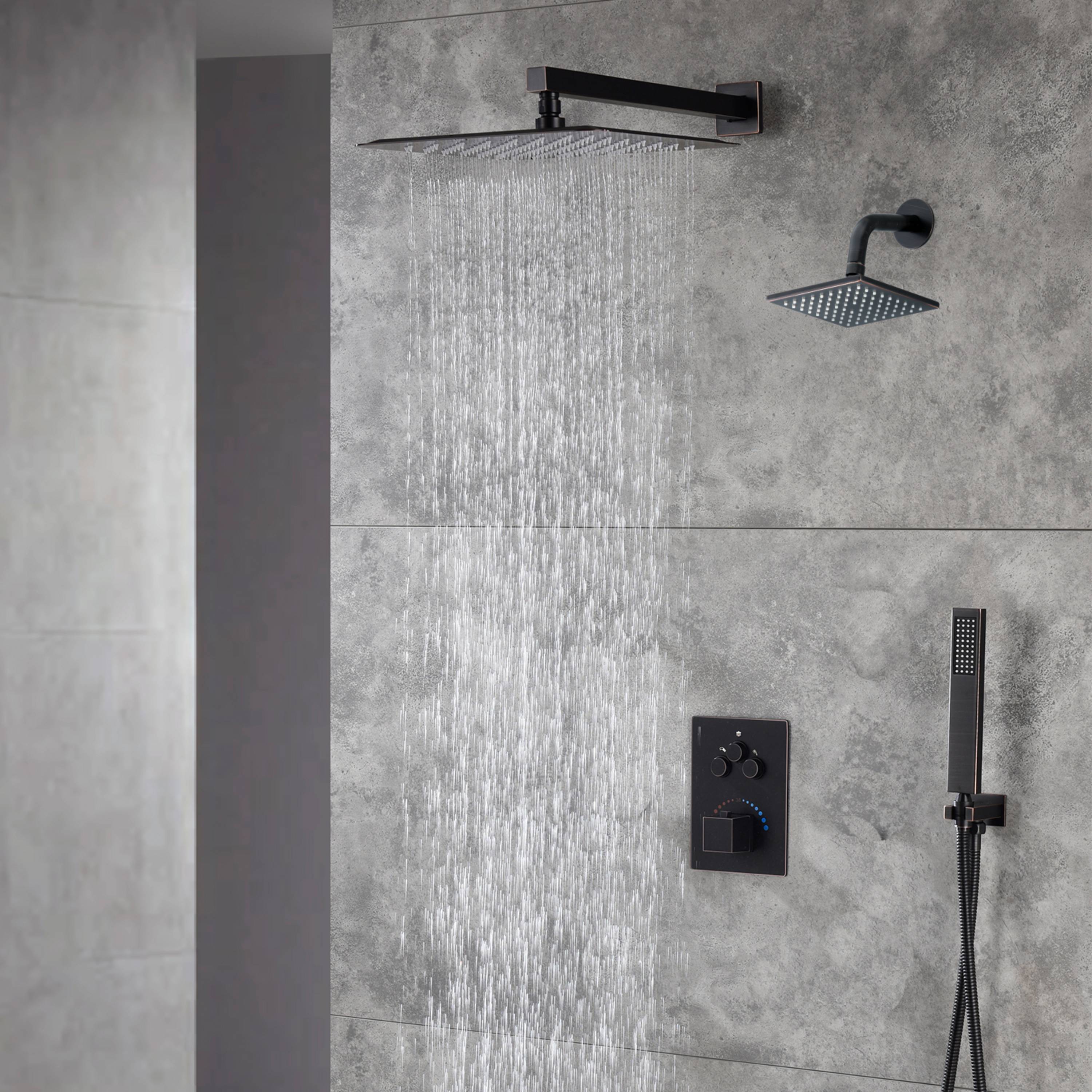 Oil Rubbed Bronze 12-Inch Rainfall Shower Head with 3-Way Thermostatic Faucet System and High-Pressure Regular Shower Head