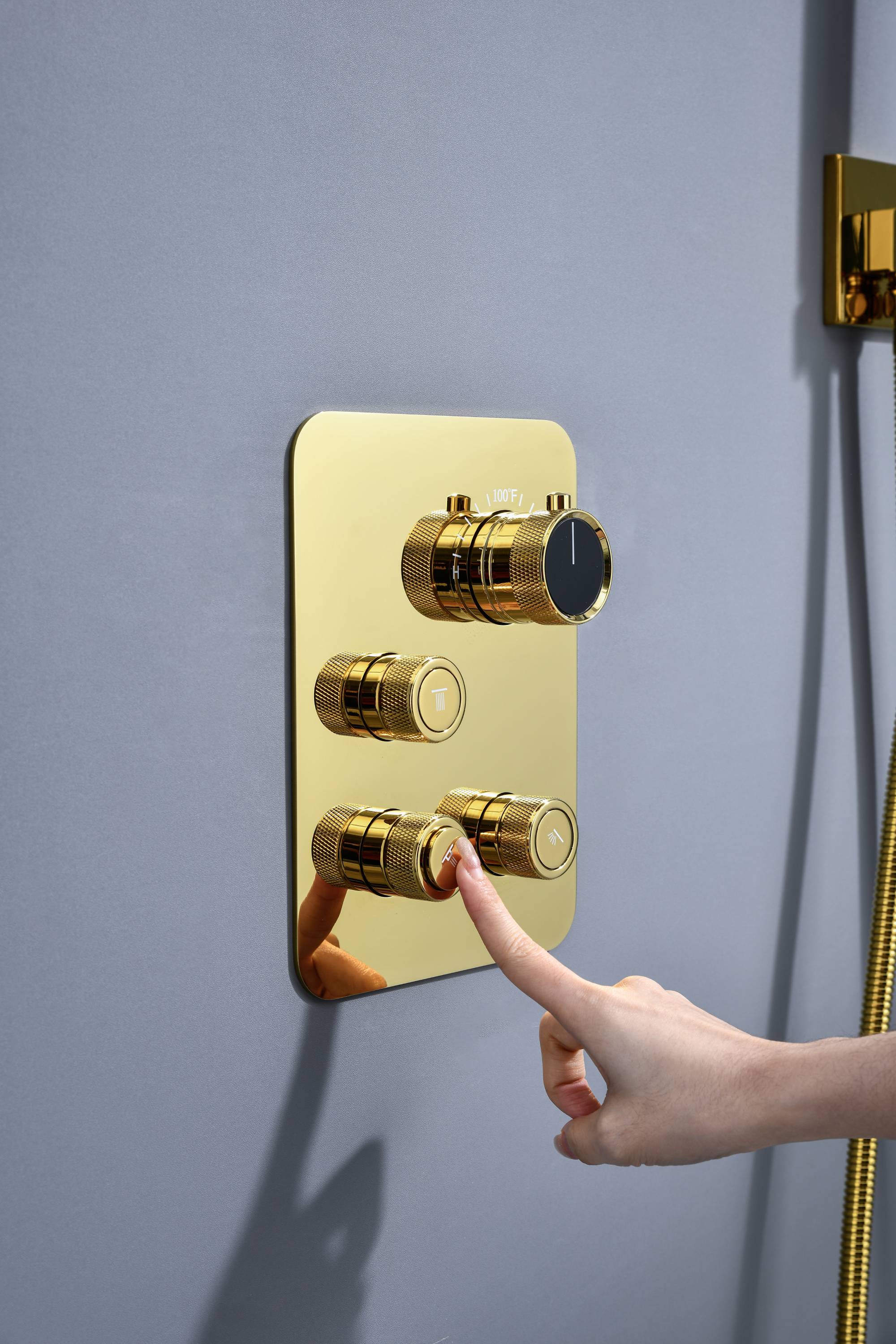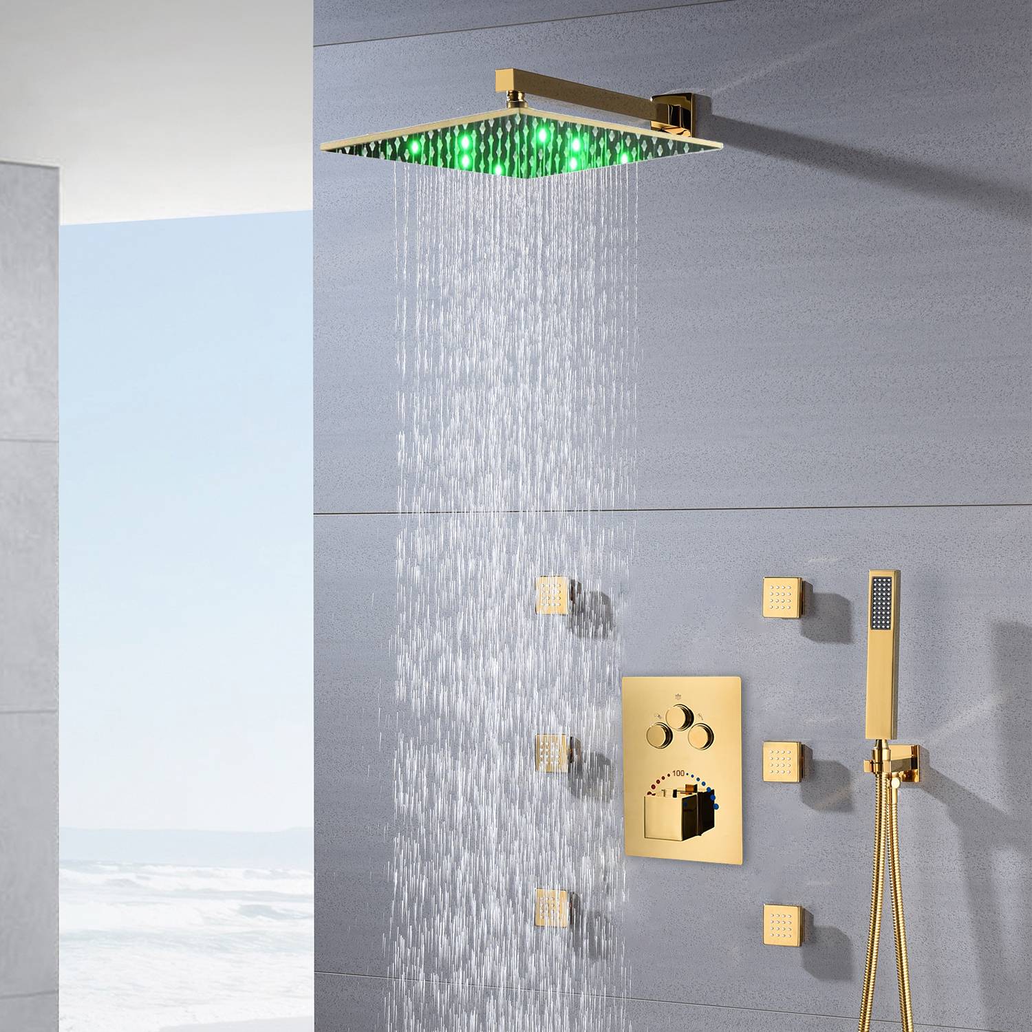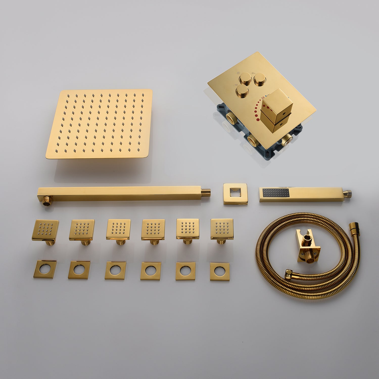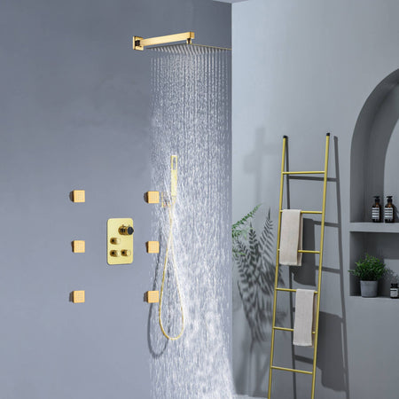 Experience the luxury of gold with our Polished Gold 3-Way Thermostatic Shower System. This comprehensive package transforms your bathroom into a personal oasis. It combines a rainfall shower head, a handheld shower, a shower arm, a shower holder, a mixer valve control, body jets, and a shower hose - all designed with a luxurious polished gold finish.