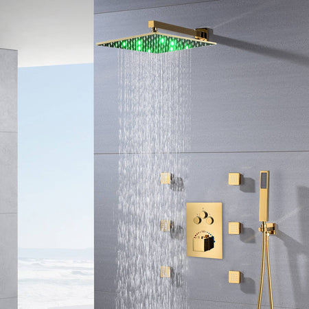 12-Inch or 16-Inch Wall-Mounted Polished Gold 3-Way Thermostatic Shower System with Optional LED Light - Multi-Function Simultaneous and Separate Operation