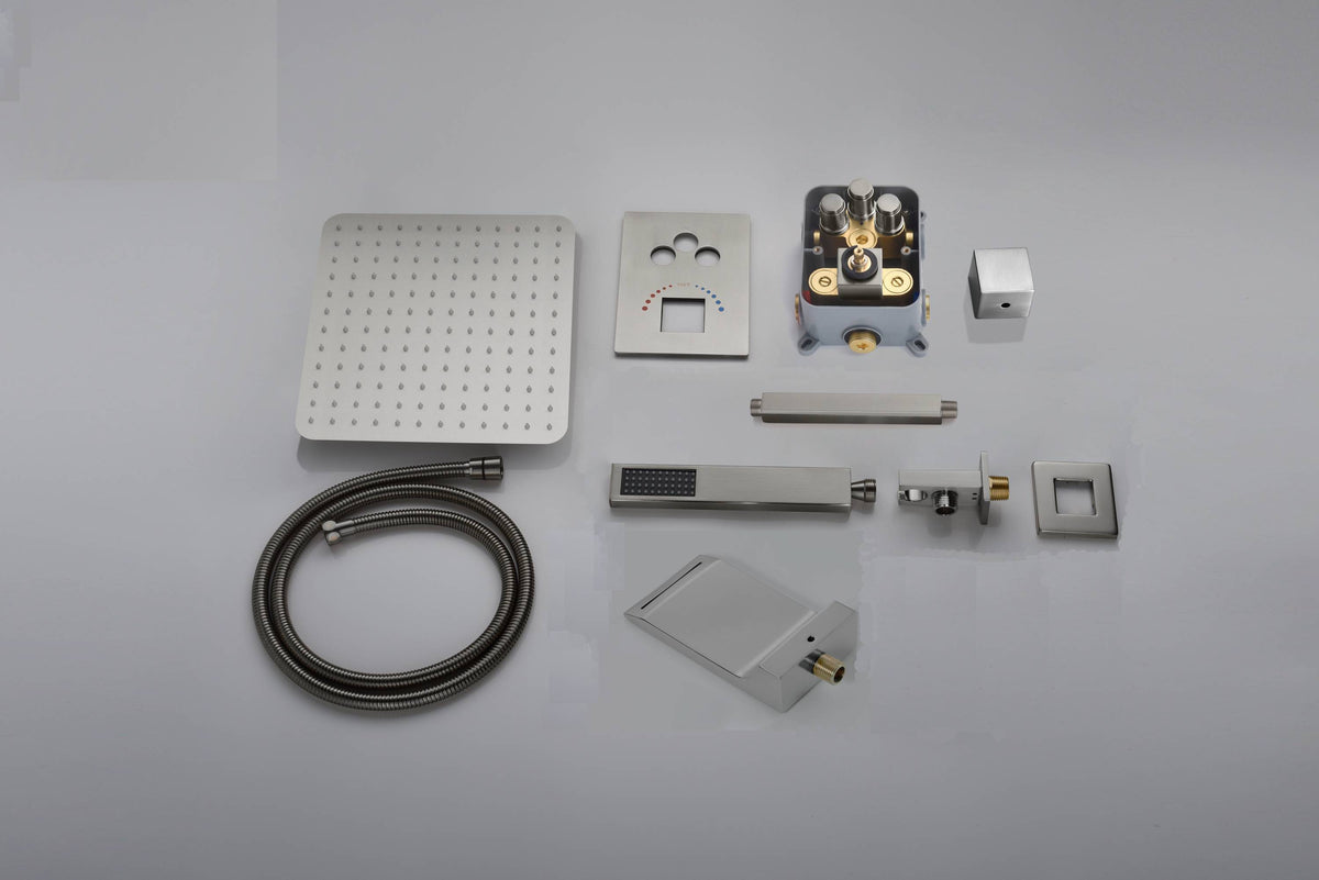 - Choose from two sizes for the top rain head: 12’’ x 12’’ or 16’’ x 16’’ for a luxurious rainfall experience.Upgrade your shower with two styles of shower heads: a classic design without LED lights for a timeless aesthetic, or an LED light-equipped style that creates a mesmerizing shower experience powered by water flow, eliminating the need for batteries. Transform your shower into an oasis of relaxation and ambiance.