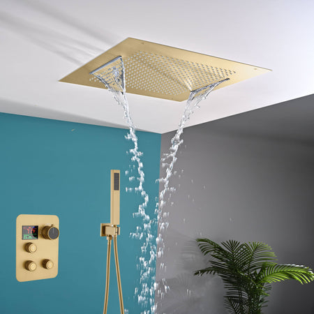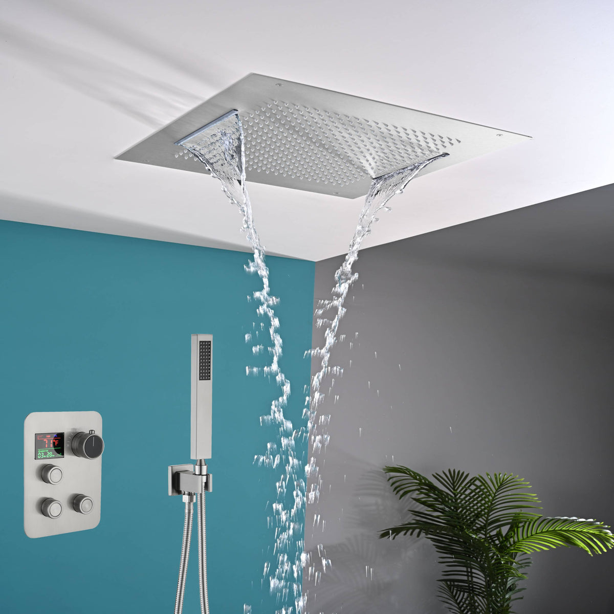 20" Flush Mount Rainfall Waterfall Shower Head with 3-Way Digital Thermostatic Faucet