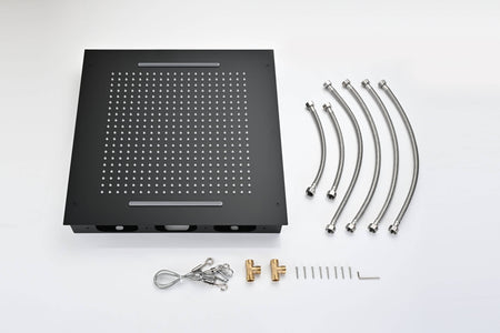 Our Premium Shower Faucet Set: Enhance your shower experience with our high-quality, feature-rich shower system. This complete package includes a brass handheld holder, a 20 inch flush mount shower head, a 59-inch stainless steel shower hose, a 3-way digital display thermostatic valve mixer with trim, and one brass handheld shower.