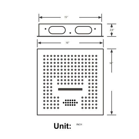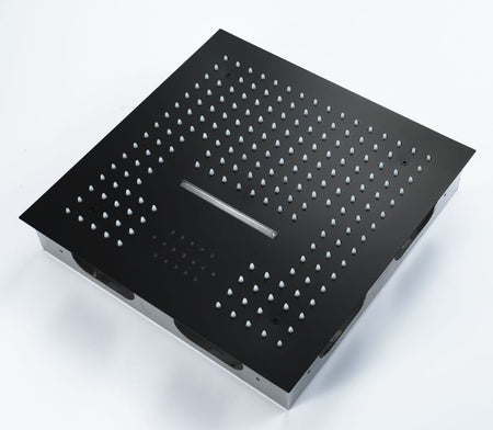 LED and Music Shower Head: The 16'' x 16'' stainless steel shower head features waterfall, rainfall, 64-color LED lights, and Bluetooth music functions. The LED lights can be controlled via a remote panel, and the music can be controlled via your cell phone.