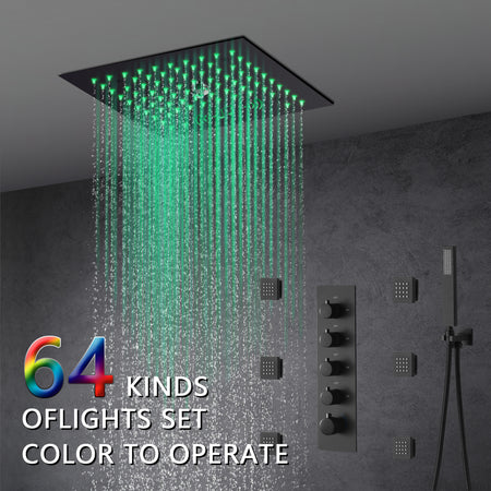 12-Inch Flush-Mount Matte Black Thermostatic Shower Faucet: 4-Way Control, 64-Color LED Lighting, Bluetooth Music, Optional Digital Display, and Body Sprayers