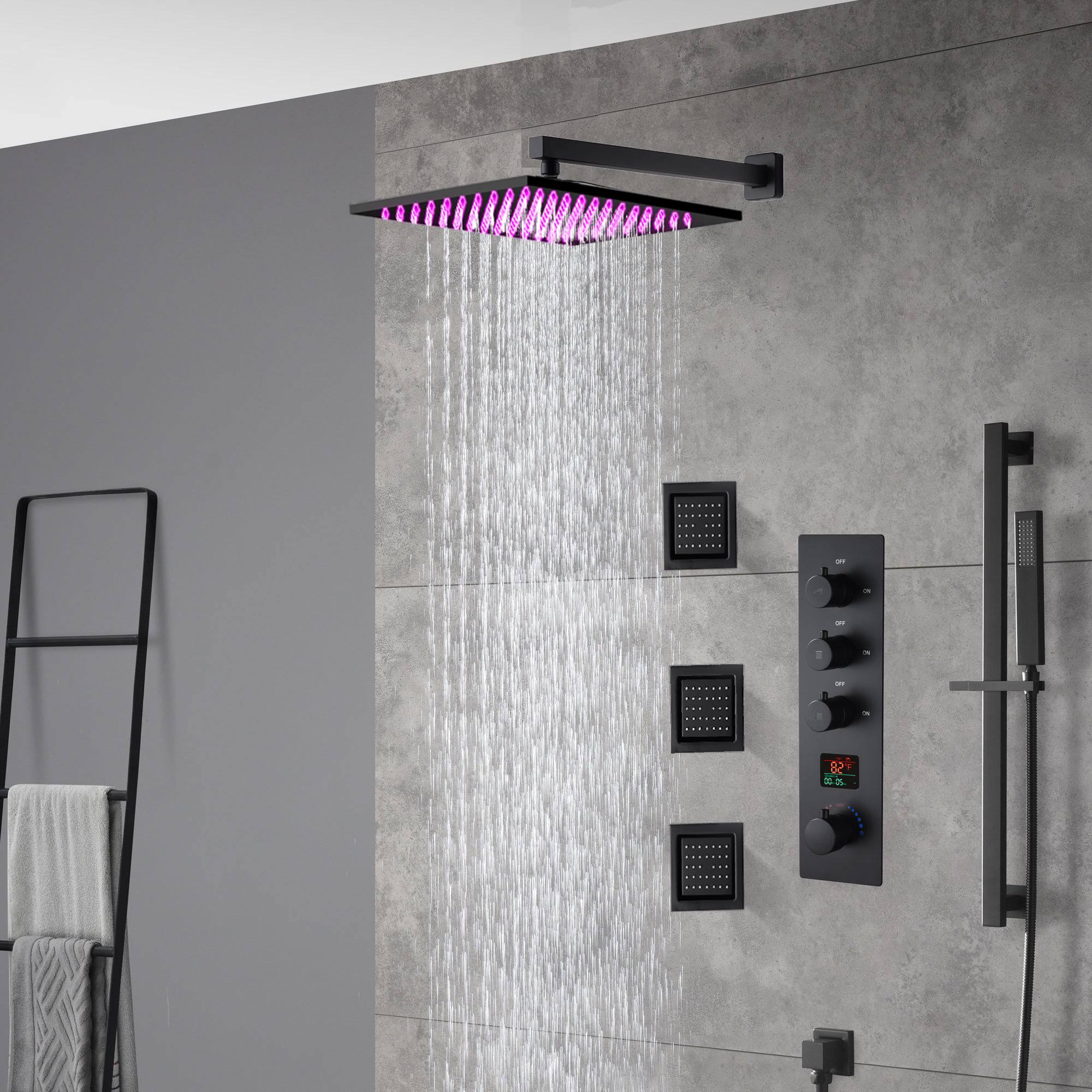 Wall mounted matte black 3 way digital thermostatic shower faucet with sliding bar and 4inch flush mounted body jets