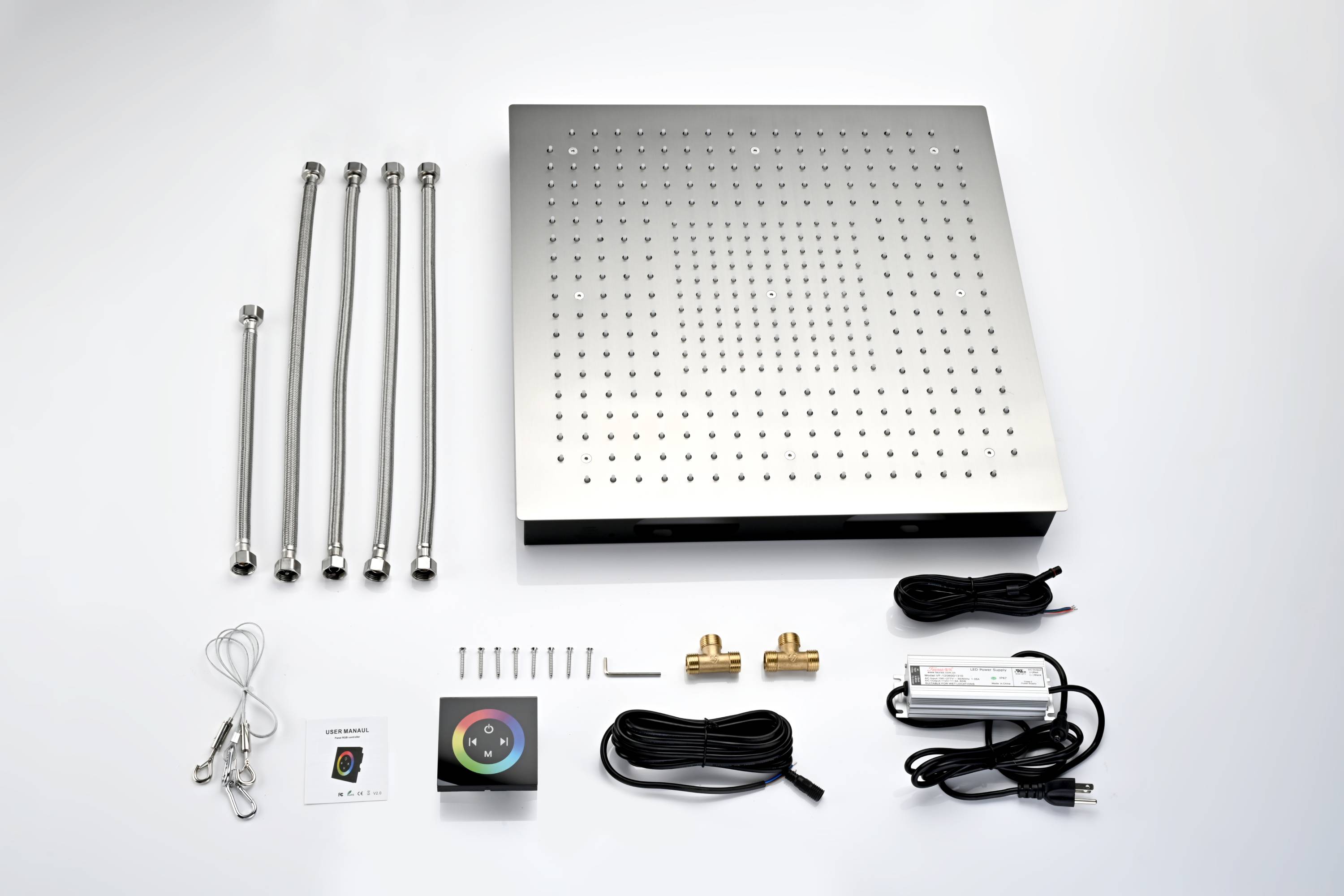- 1 Rainfall shower head (20 inches, made from 304 stainless steel)