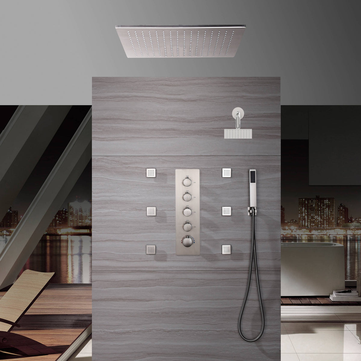 The integrated thermostatic cartridge ensures a consistent water temperature, providing a safe and comfortable shower experience. The set includes two generously sized shower heads (20 x 20 inches and 6 x 6 inches) to suit different showering needs.