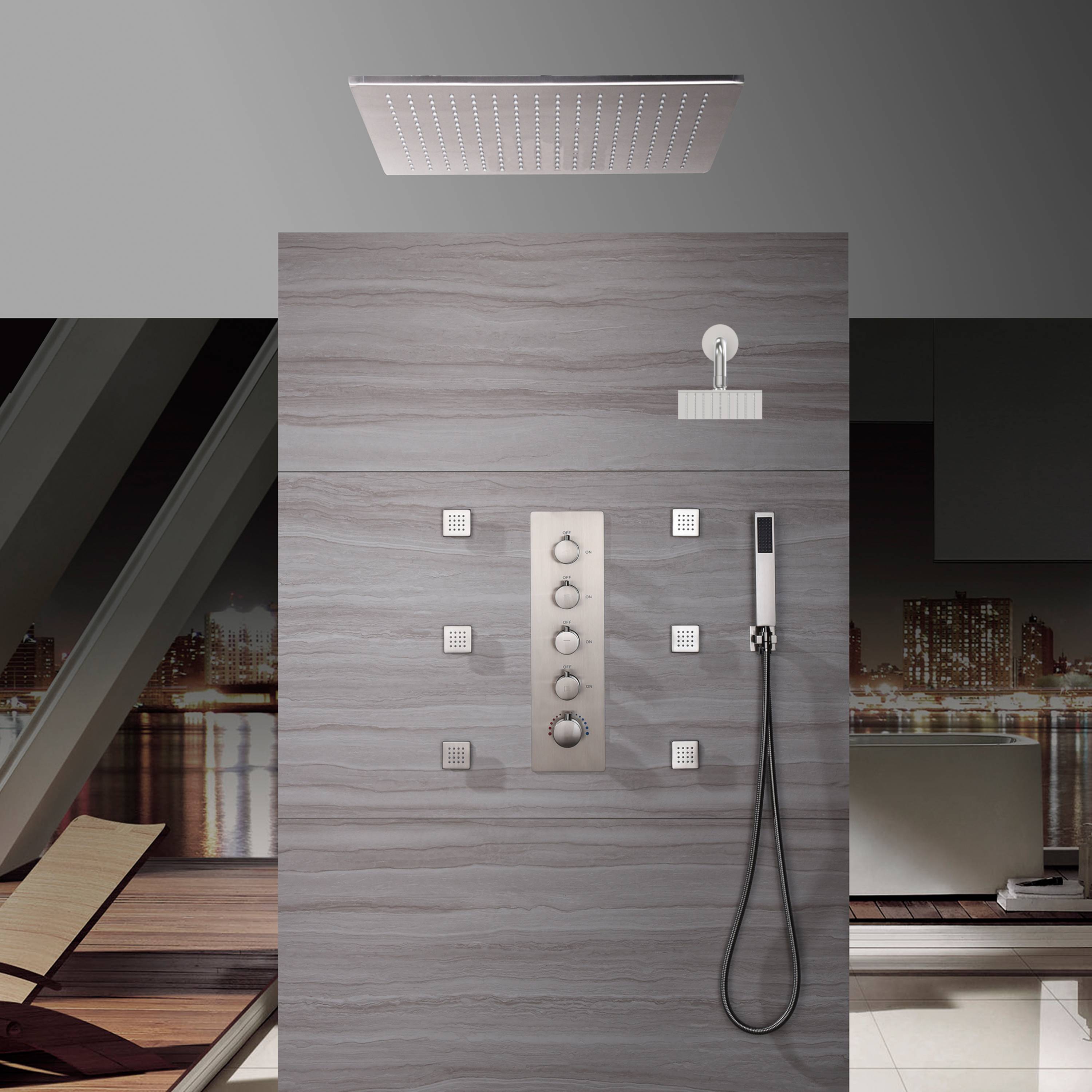 20" Brushed Nickel Rainfall Shower System: Ceiling/Flush-Mounted, Thermostatic Valve, 6 Jets, 6" Regular Head