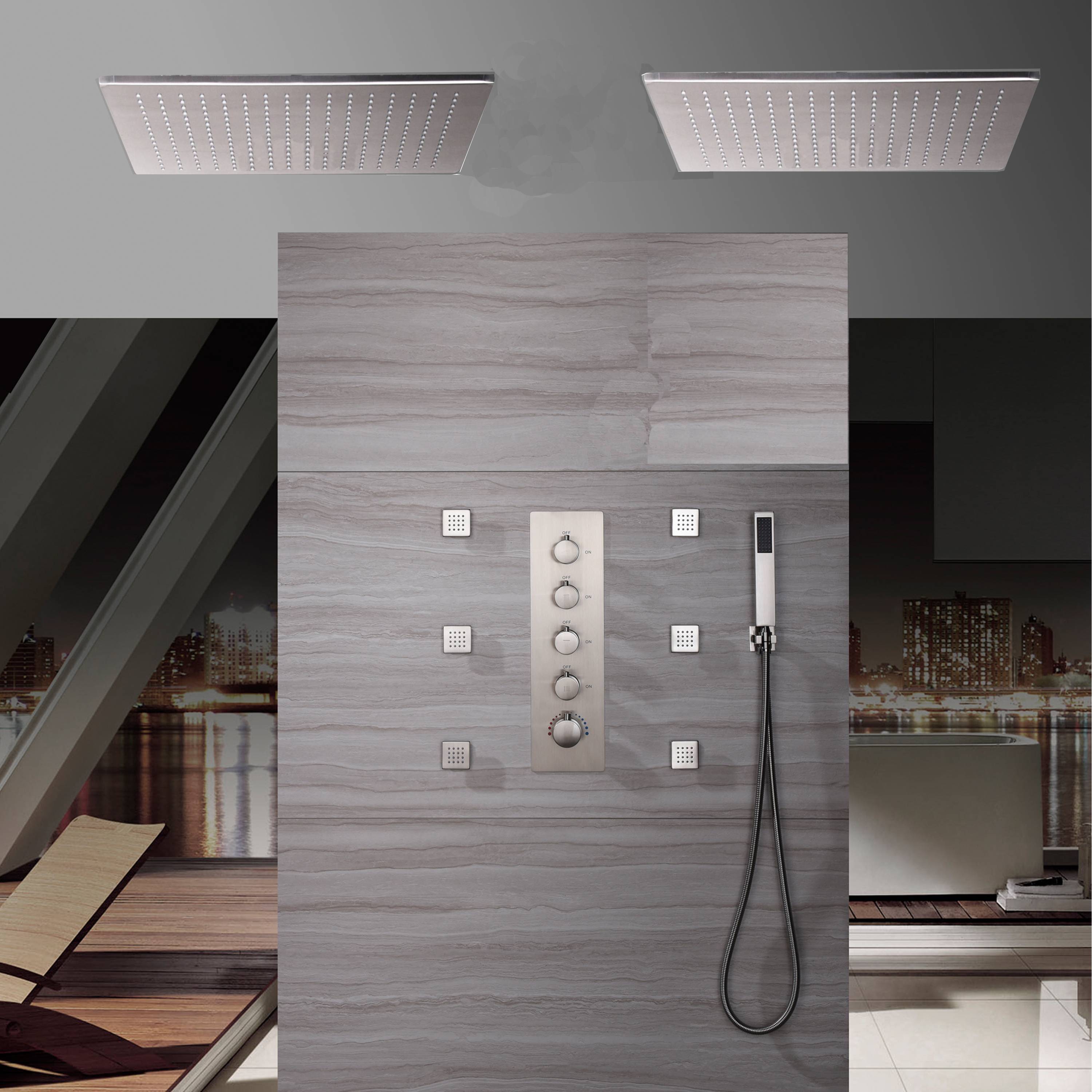 Brushed Nickel 4-Way Thermostatic Shower System with Dual 20-Inch Ceiling Mount Rain Heads and 6 Body Jets
