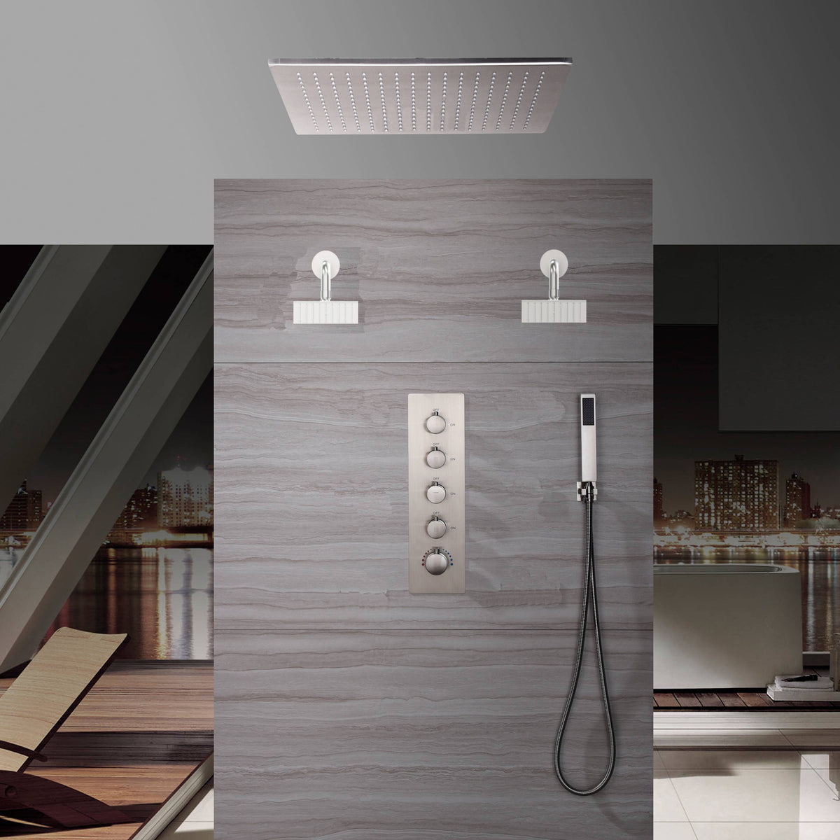20 Inch Brushed nickel ceiling mount rainfall shower systems 4 way thermostatic valve with 6 body jets and wall mount 6 inch regualr shower head
