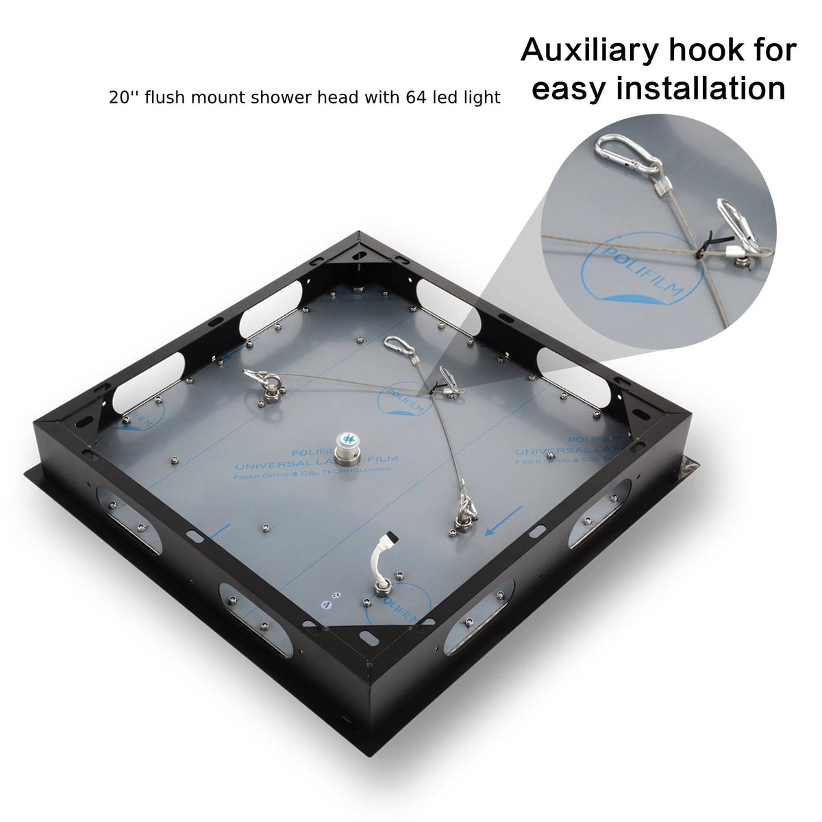 This shower head features 64 LED lights powered electronically, offering a modern touch. It is designed for easy flush mounting on the ceiling, providing a sleek appearance. -