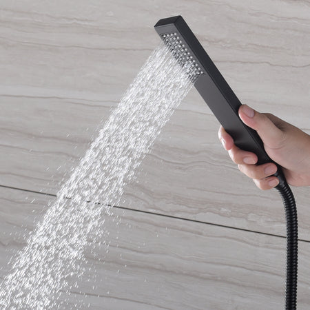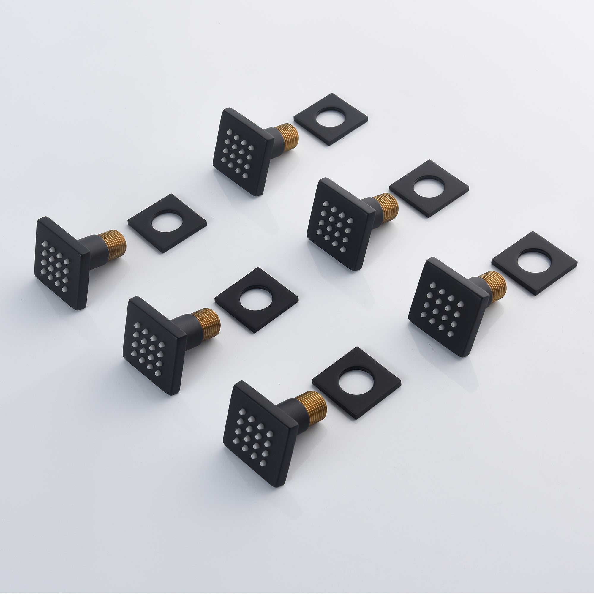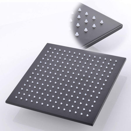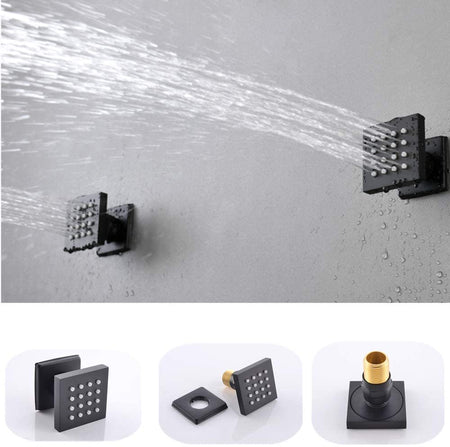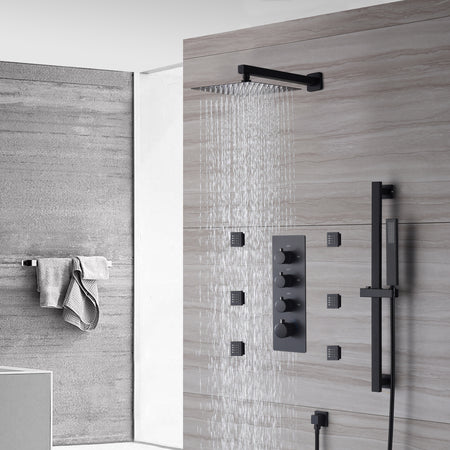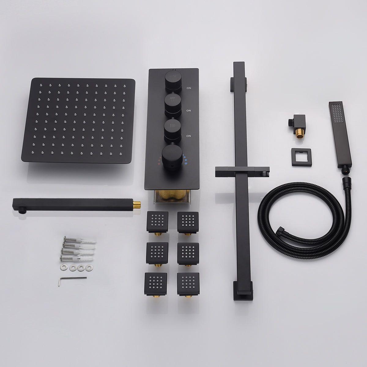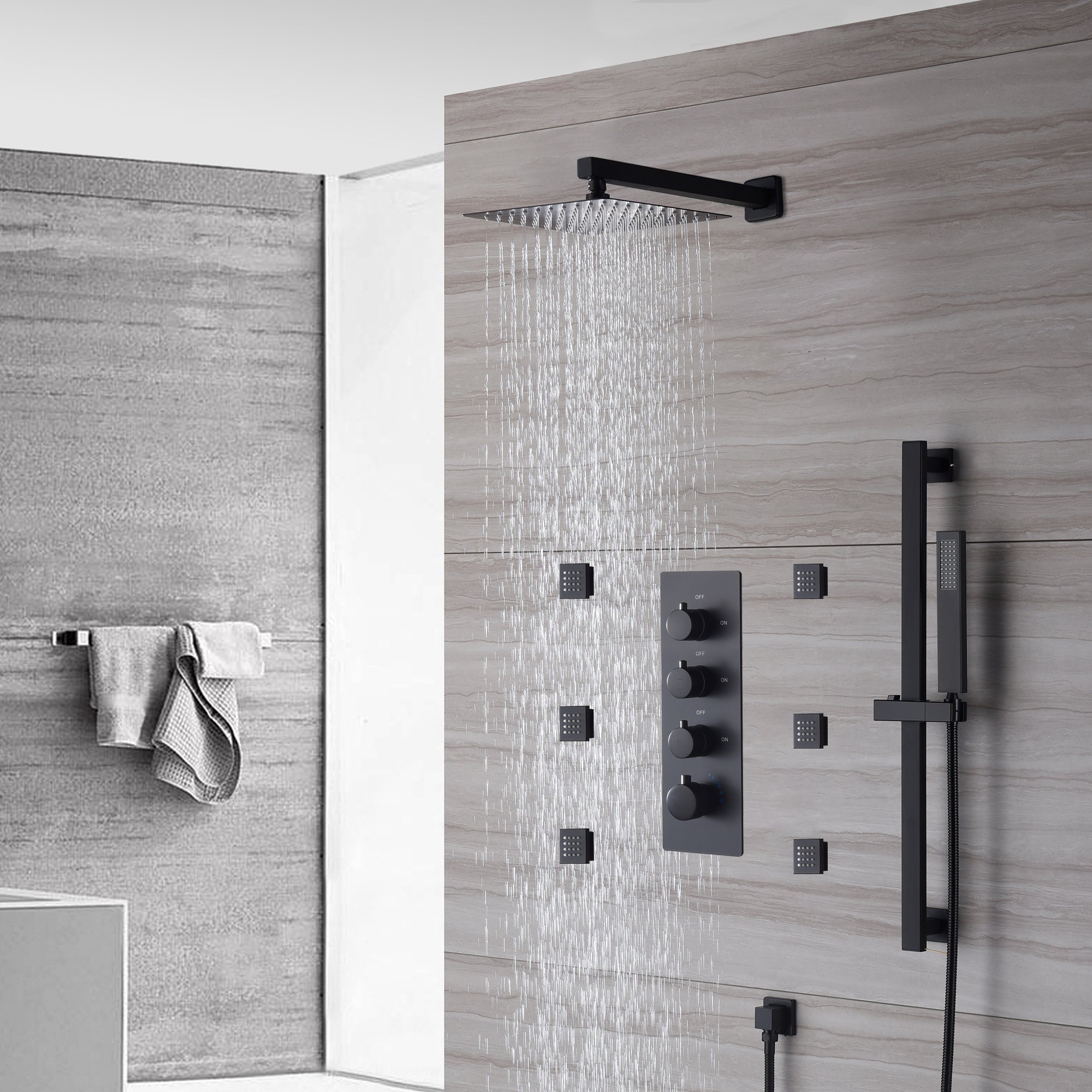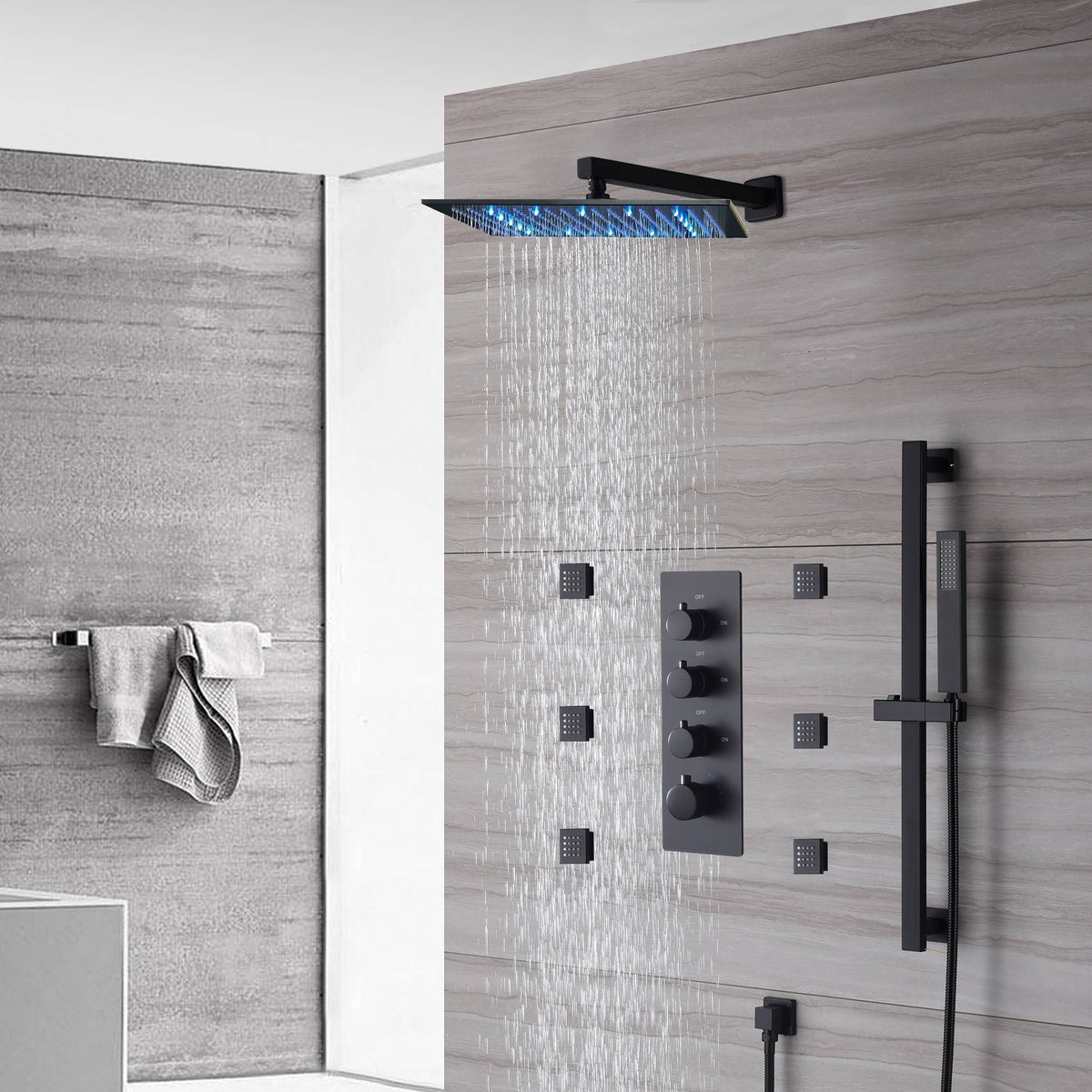 Matte Black Wall-Mounted 3-Way Thermostatic Shower Faucet with 12-Inch or 16-Inch LED or Non-LED Shower Head, Body Jets, and Sliding Bar