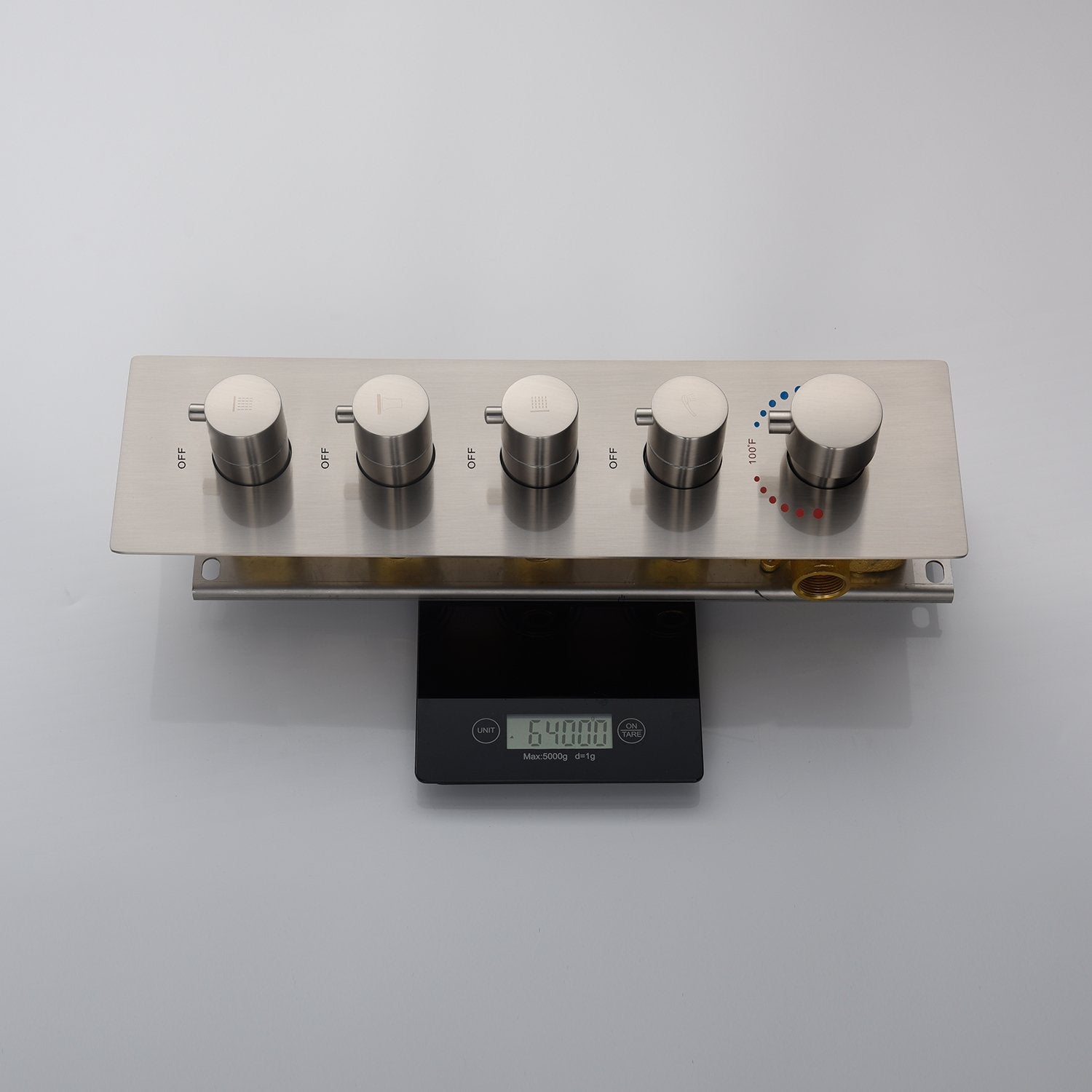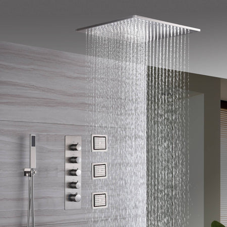 20inch Brushed nickel ceiling mount rainfall waterfall shower systems 4 way thermostatic valve with 3 flushed body jets