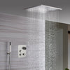 The 20 x 20-inch shower head is designed for a waterfall or rainfall shower experience, each offering a unique feel. Each function can operate simultaneously or separately, with each diverter knob controlling the water flow and pressure, allowing you to tailor your shower to your preferences.
