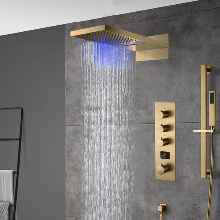 The Exquisite 22-Inch Brushed Gold 3-Way Digital Display Thermostatic Shower Valve System with Simultaneous and Individual Functionality
