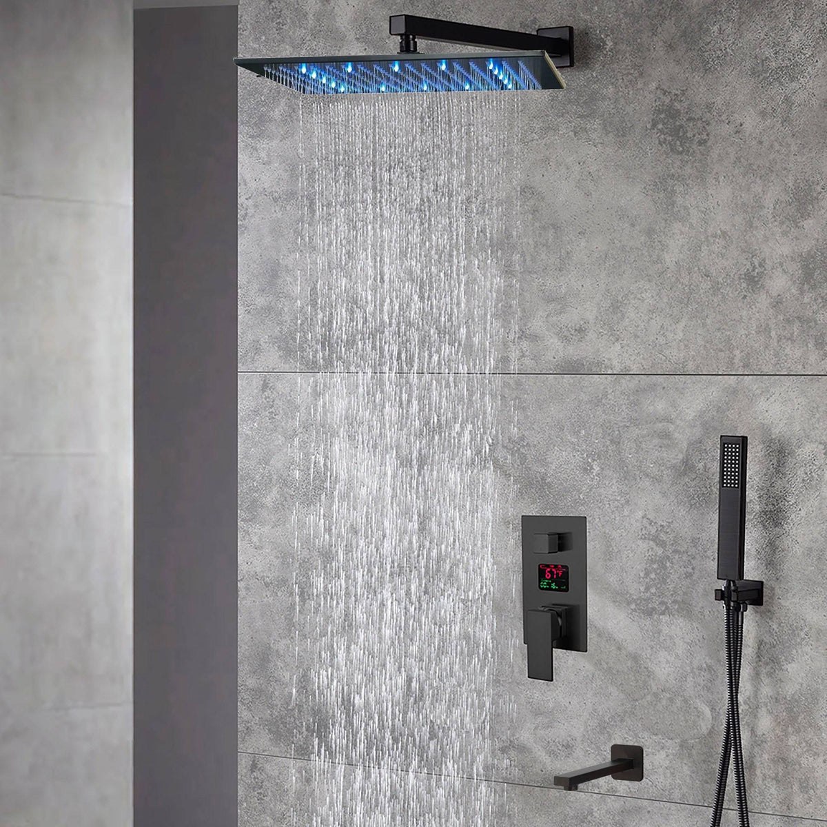 Matte Black LED 3-Way Digital Shower Faucet: 12" or 16" with Rain Head and Tub Spout
