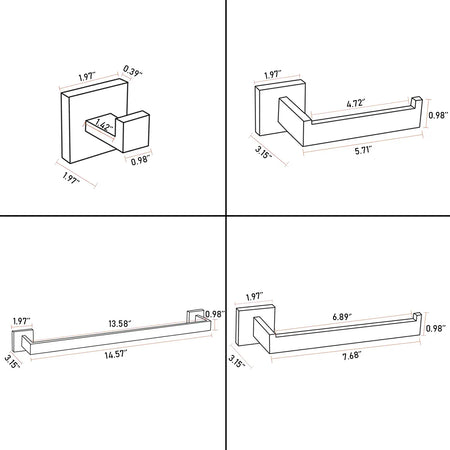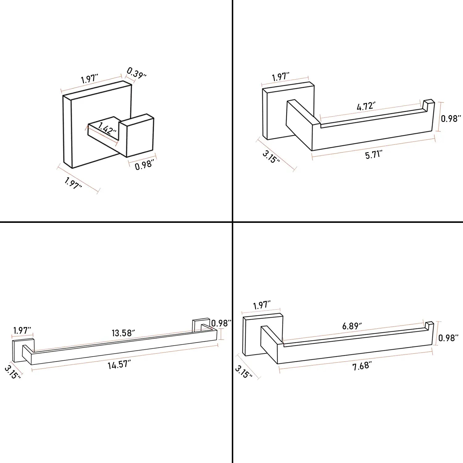 Functionality: This 4-piece set includes essential bathroom accessories that are commonly used, ensuring practicality and convenience. It consists of a towel bar, towel ring, toilet paper holder, and robe hook, catering to your various needs and providing a complete solution for organizing and hanging bathroom essentials.