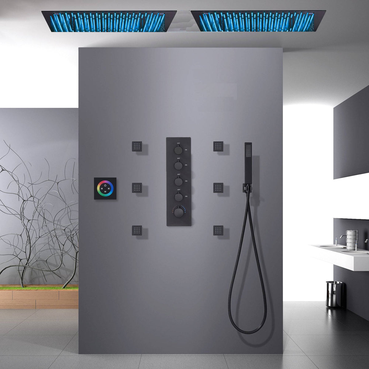 Matte Black Flush-Mounted 4 Way Thermostatic Shower with Dual 20-Inch LED Rainfall Heads and 6 Body Jets