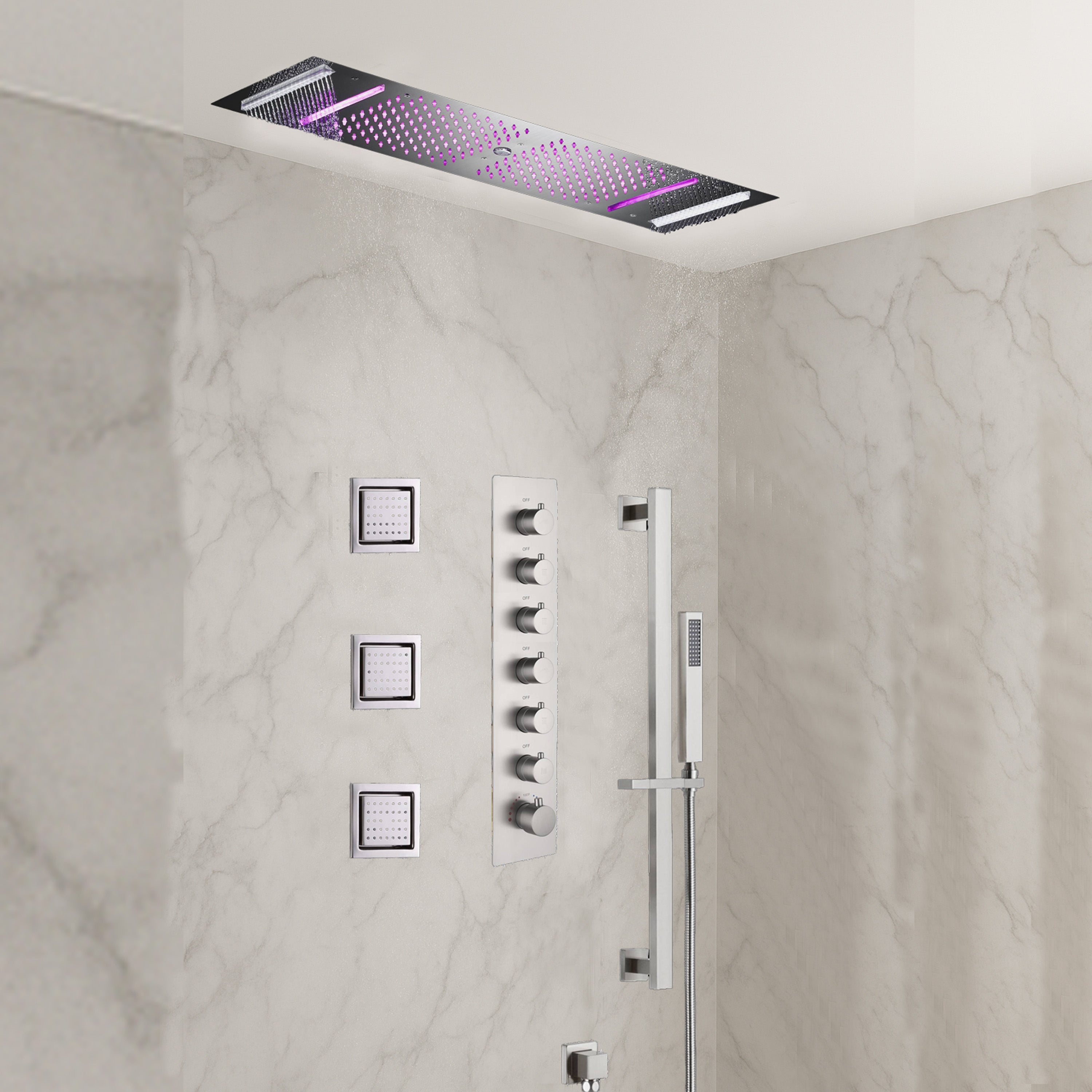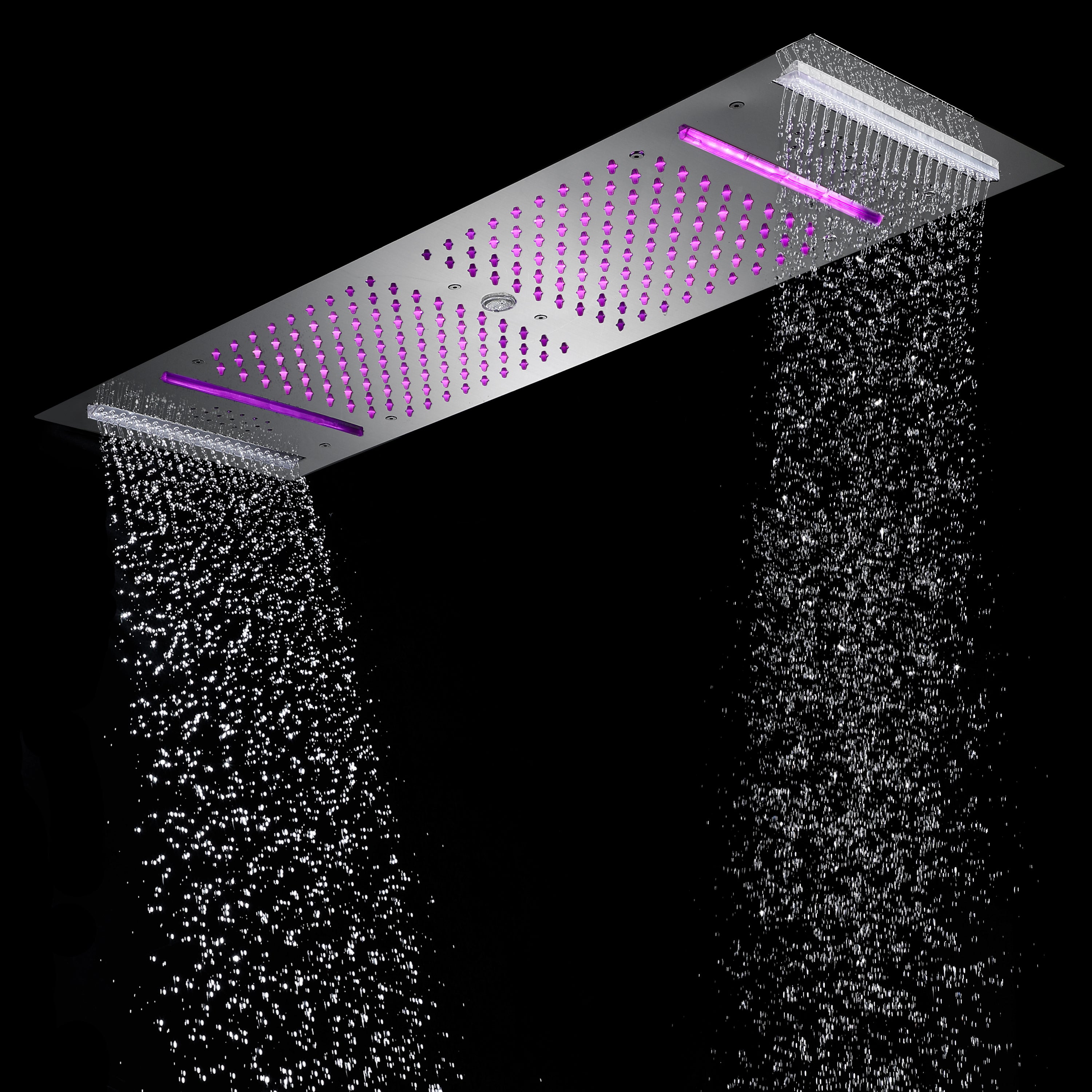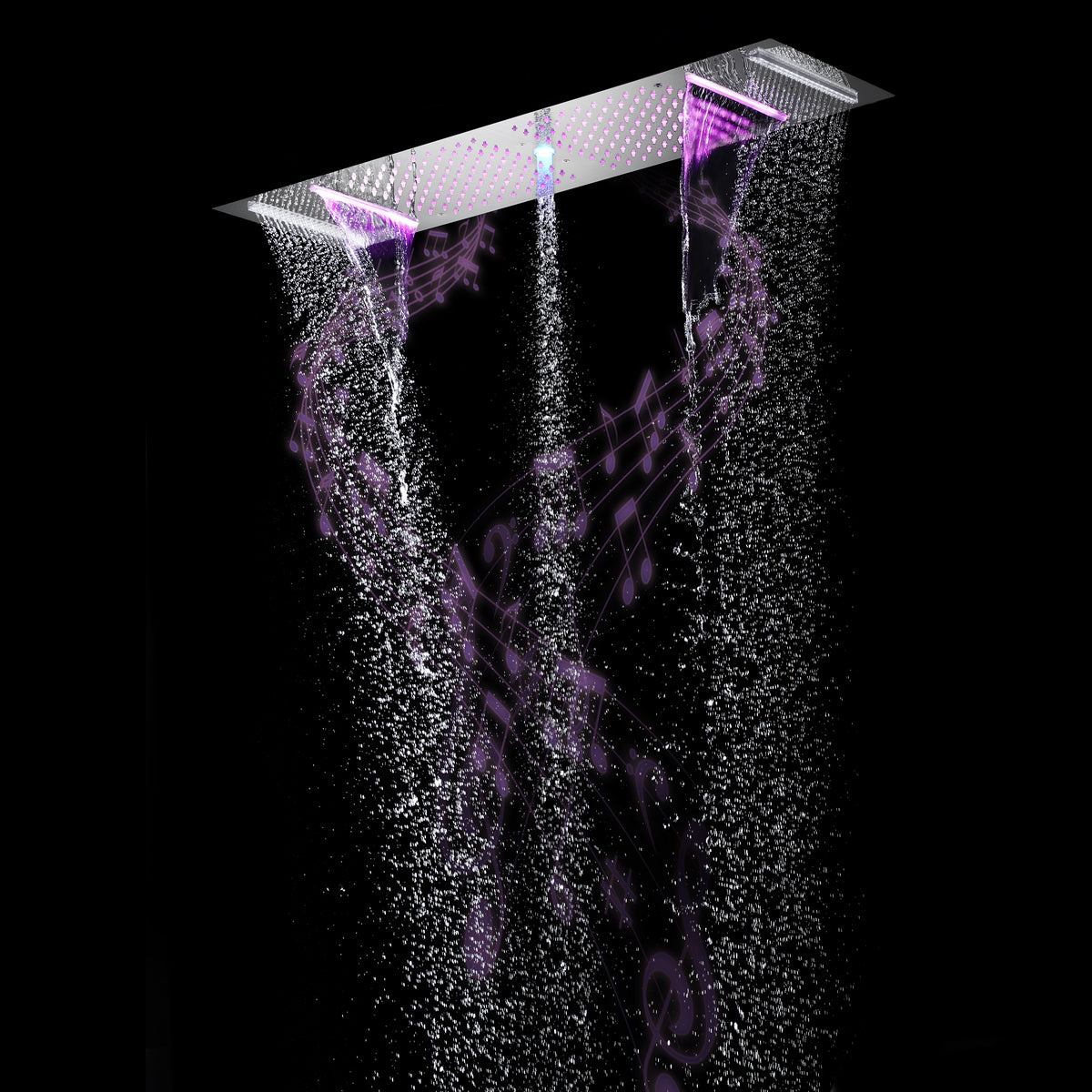 The set includes a 36 x12'' LED-lit shower head with 64 color options and Bluetooth music capability, providing a captivating shower experience. The flush-in installation allows for seamless integration into your bathroom decor.