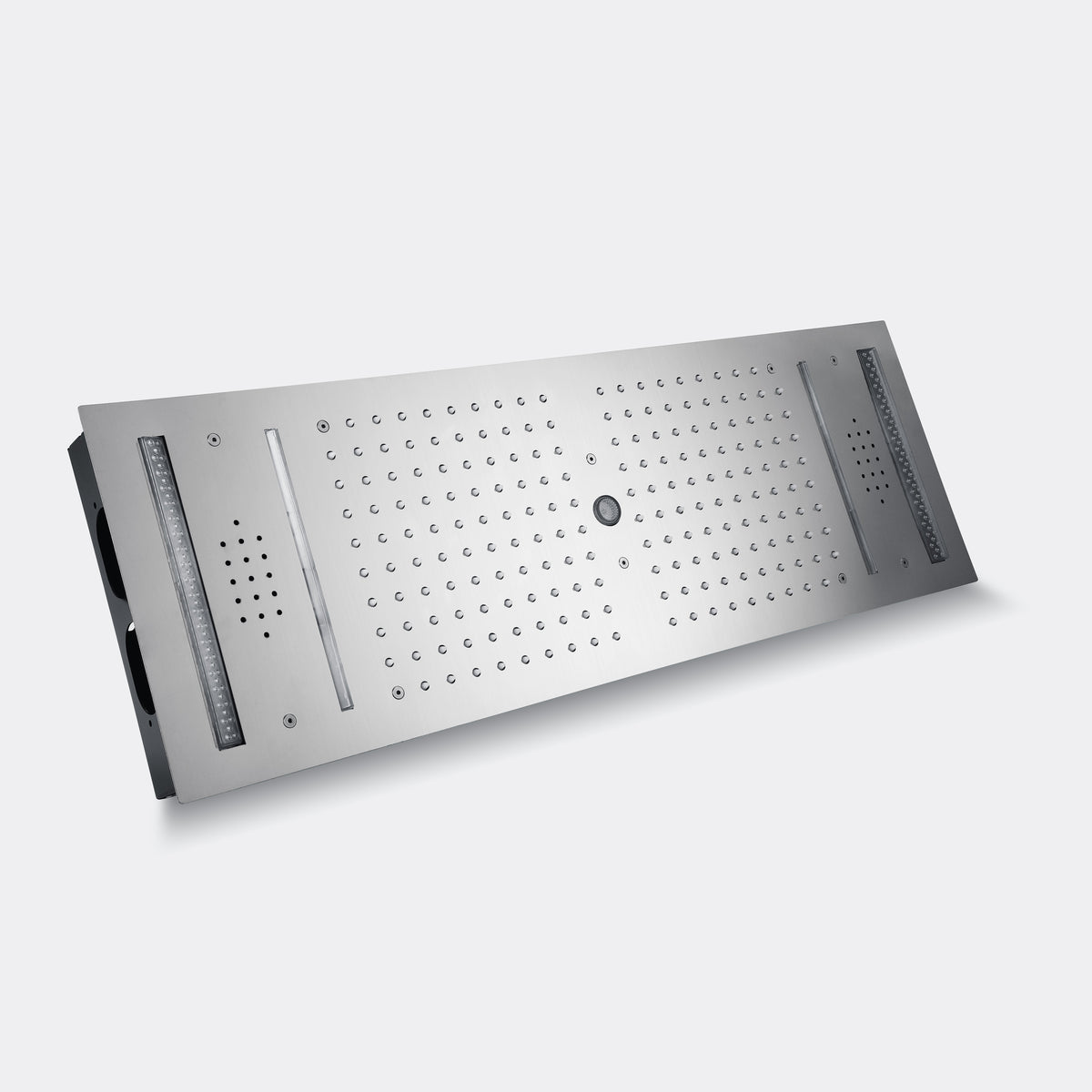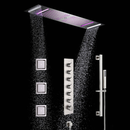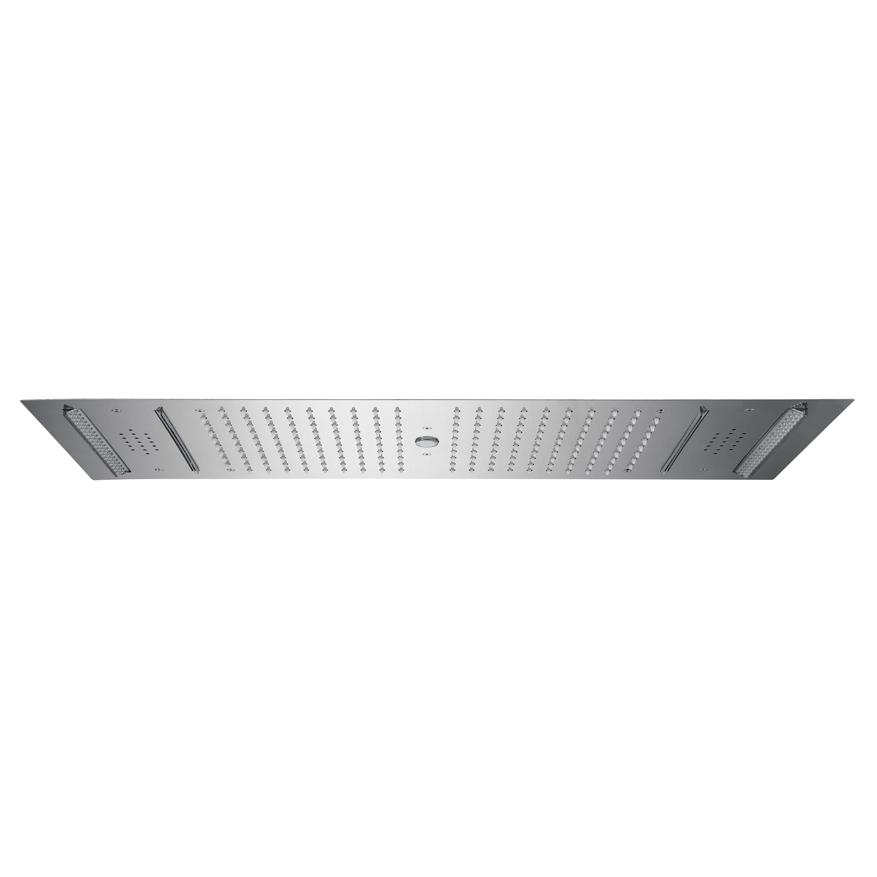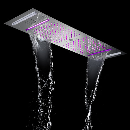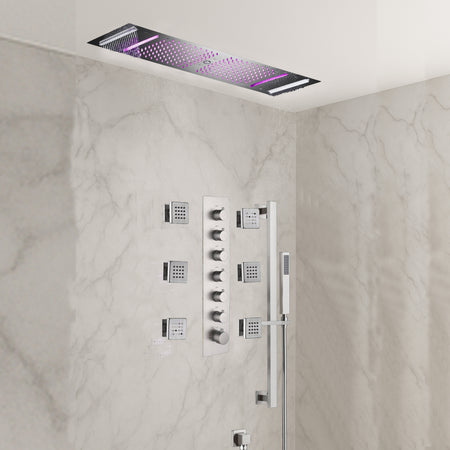 The set includes a 36 x12'' LED-lit shower head with 64 color options and Bluetooth music capability, providing a captivating shower experience. The flush-in installation allows for seamless integration into your bathroom decor.