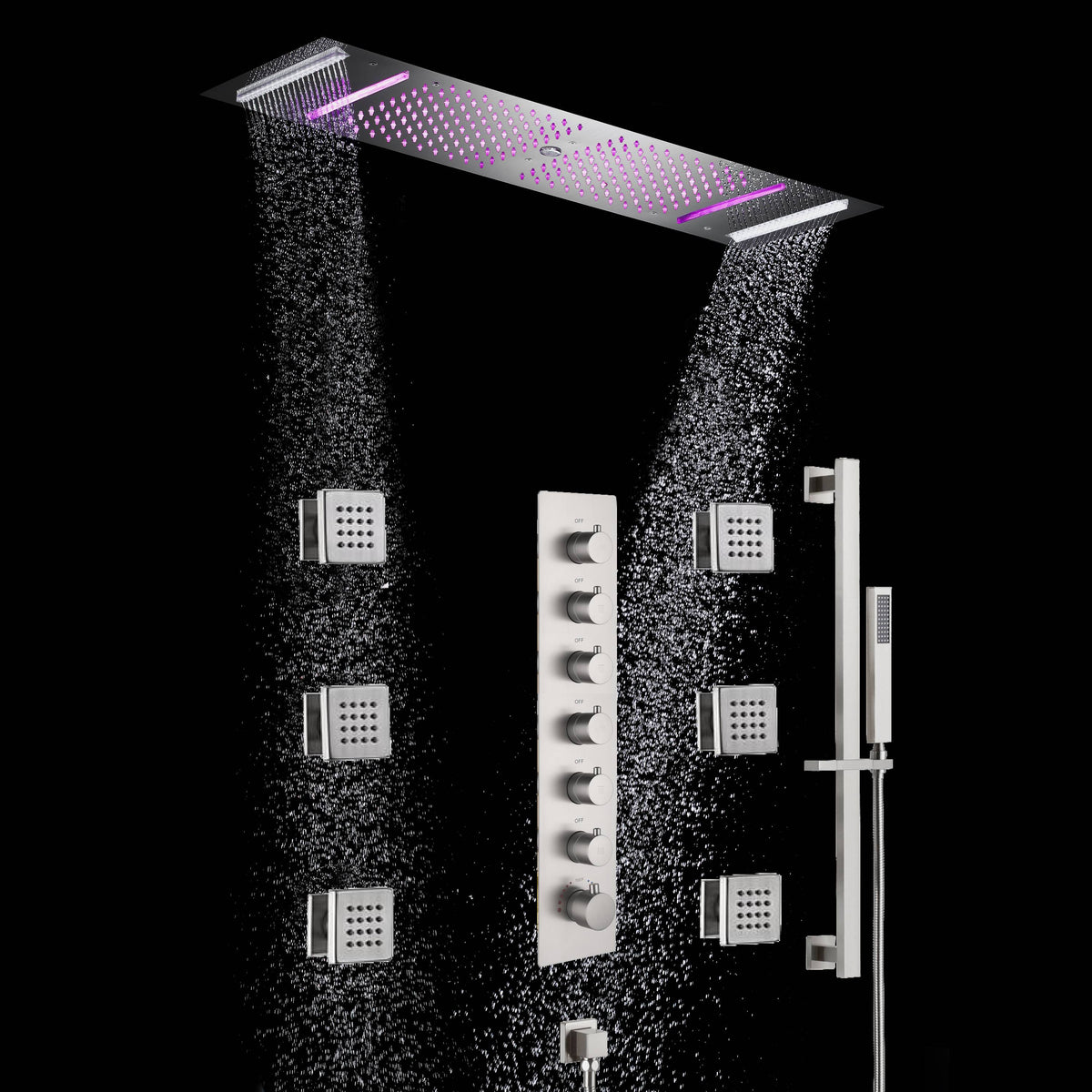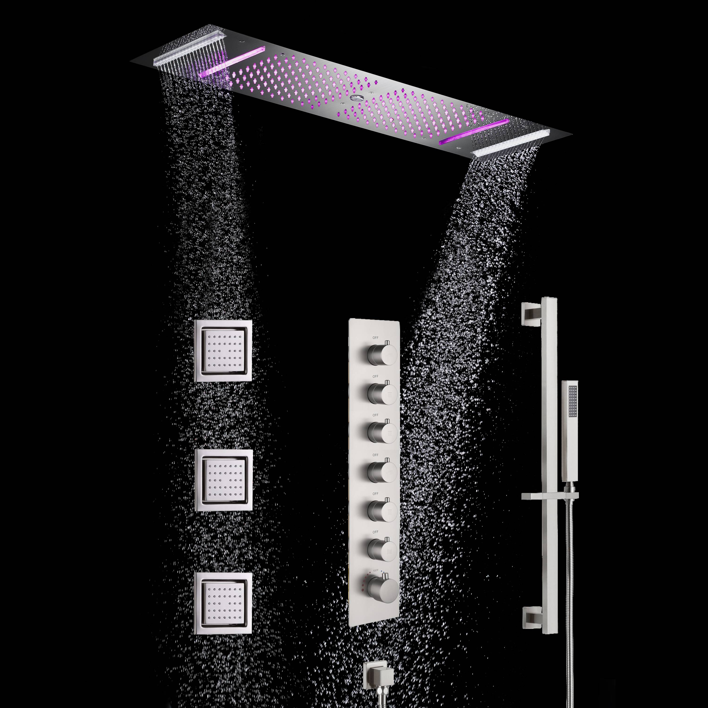 64 LED colors music led flushed in 36x12 inch 4 functions shower head 6 way thermostatic shower faucet with flush 4 inch body jets